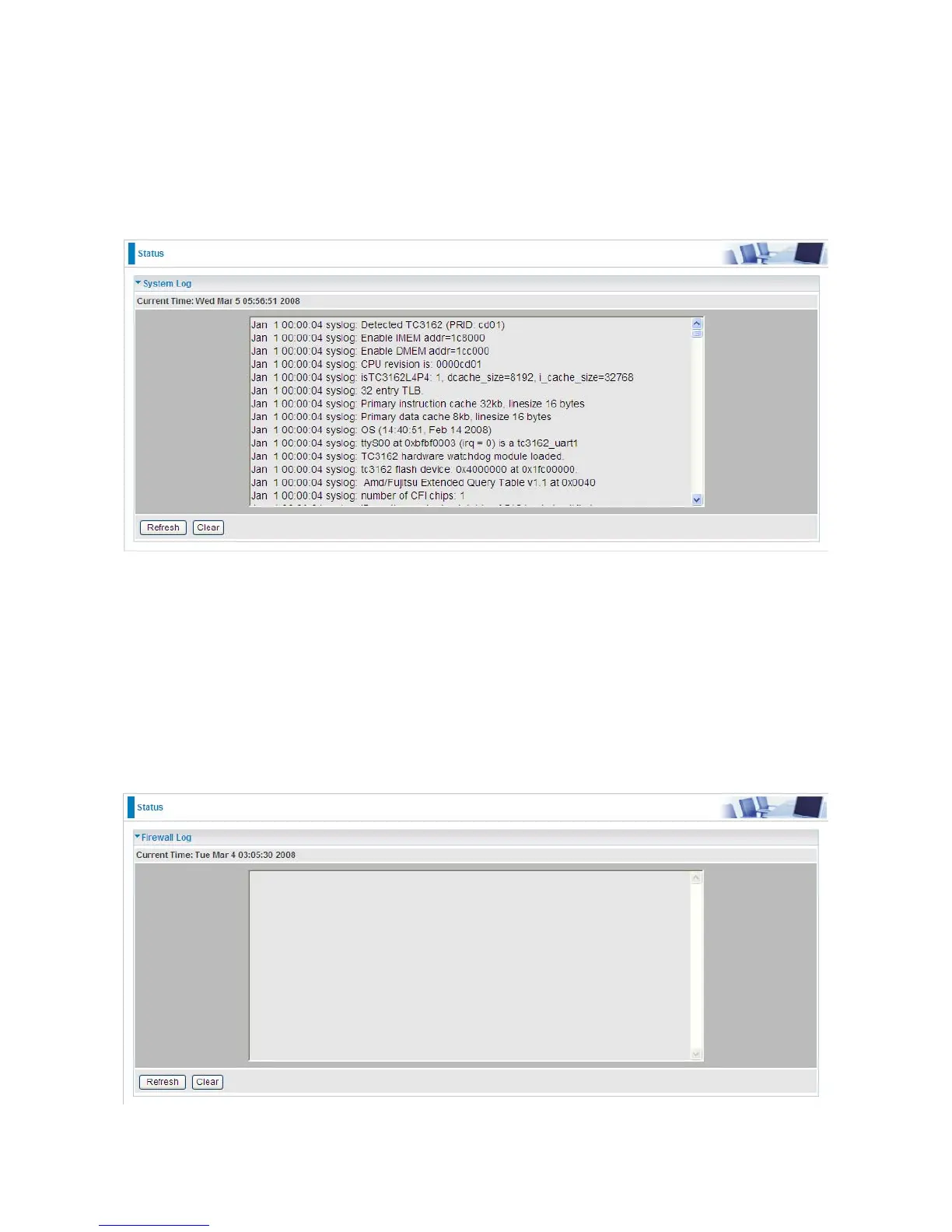 This page displays the router’s Firewall Log entries. The log shows log entries when you