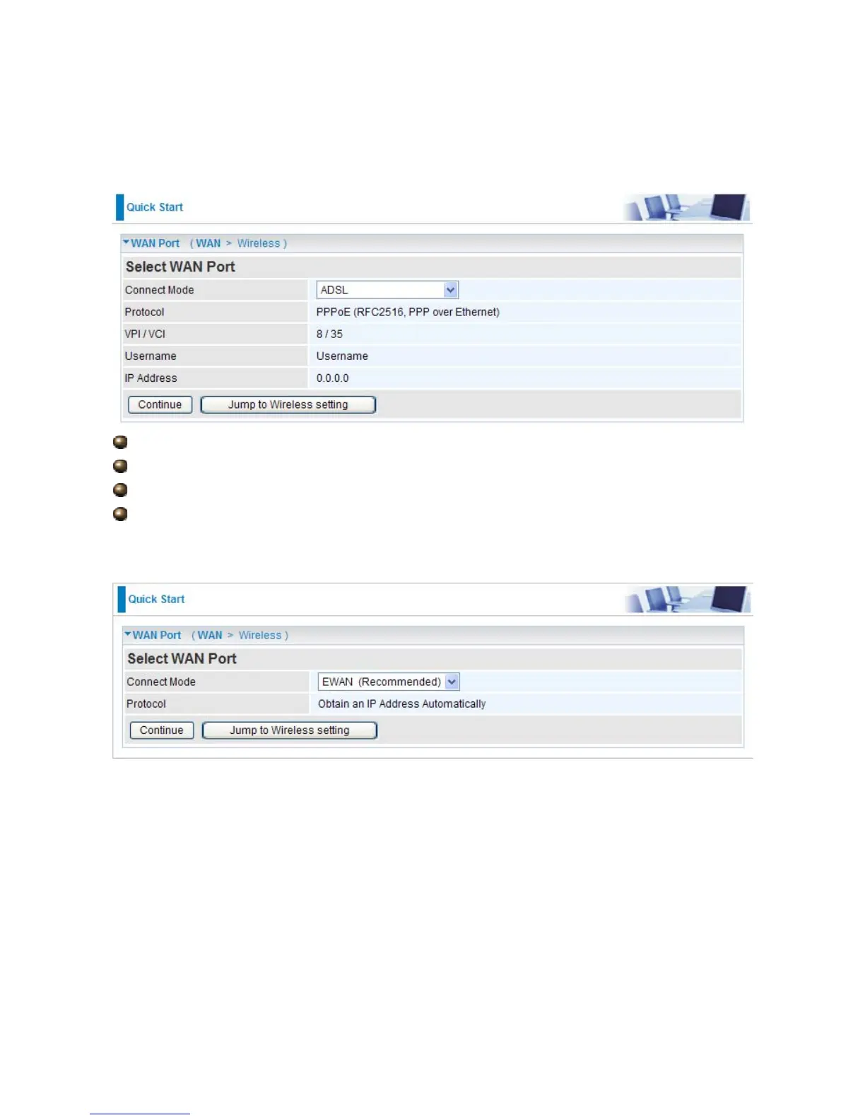 Click on Continue to choose the Protocol to connect with EWAN or click Jump to Wireless