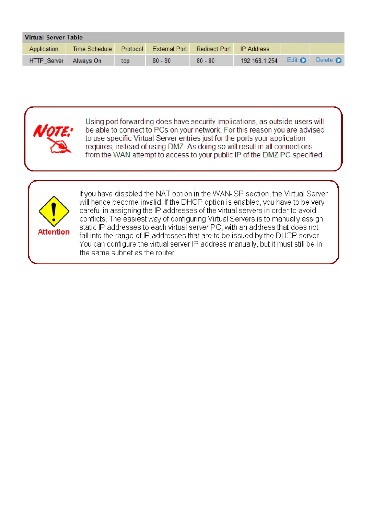 Delete: Click to remove virtual server application entry.