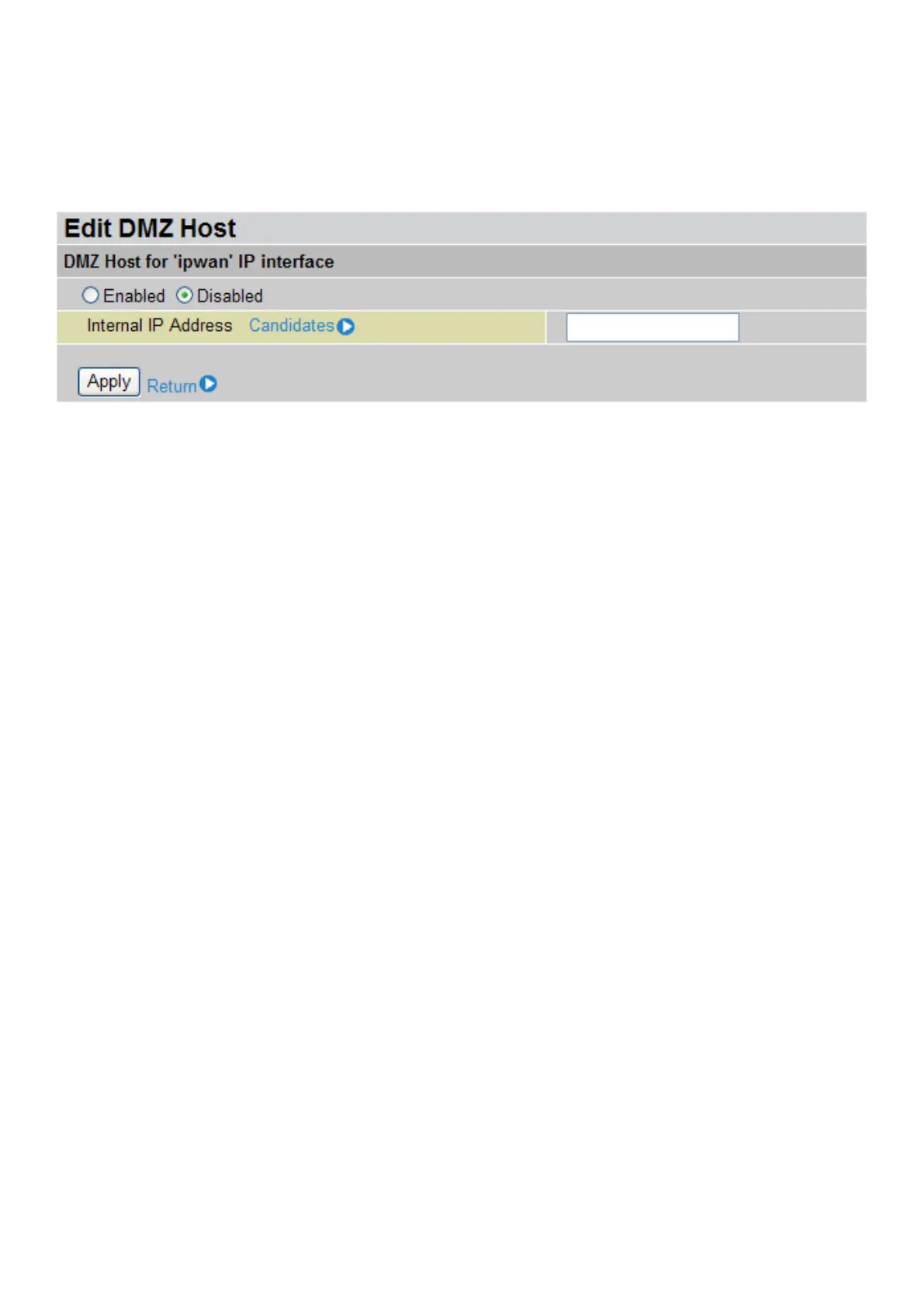 Internal IP Address: Specify a static IP address to the DMZ Host when the Enabled radio button is
