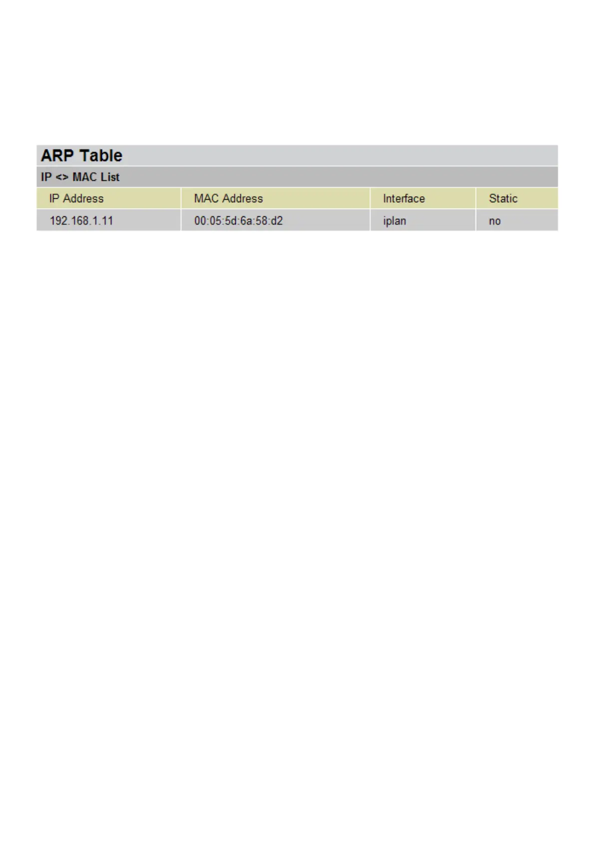 This section displays the router ARP (Address Resolution Protocol) Table which shows the mapping