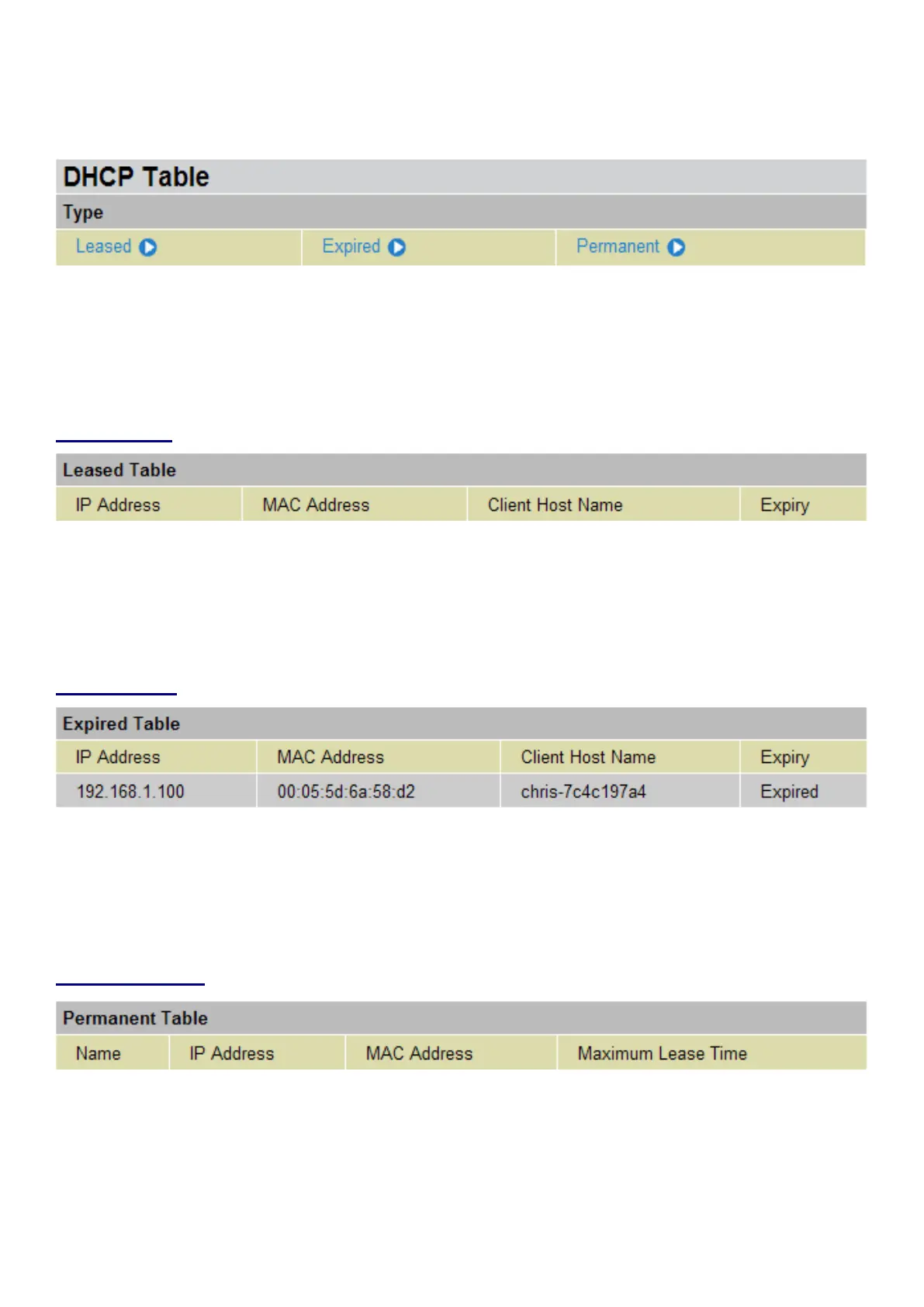 The DHCP Table lists the DHCP lease information for all IP addresses assigned by the DHCP