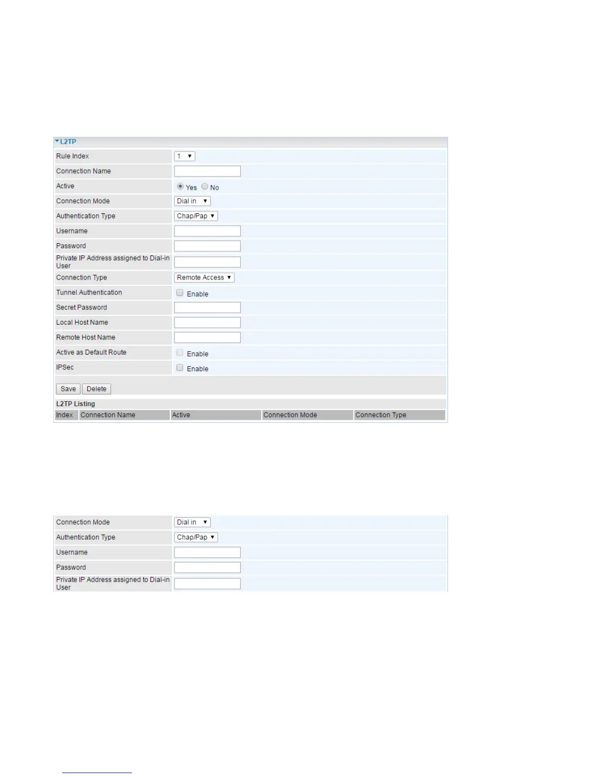 Connection Mode: Select Dial In to operate as a L2TP server.