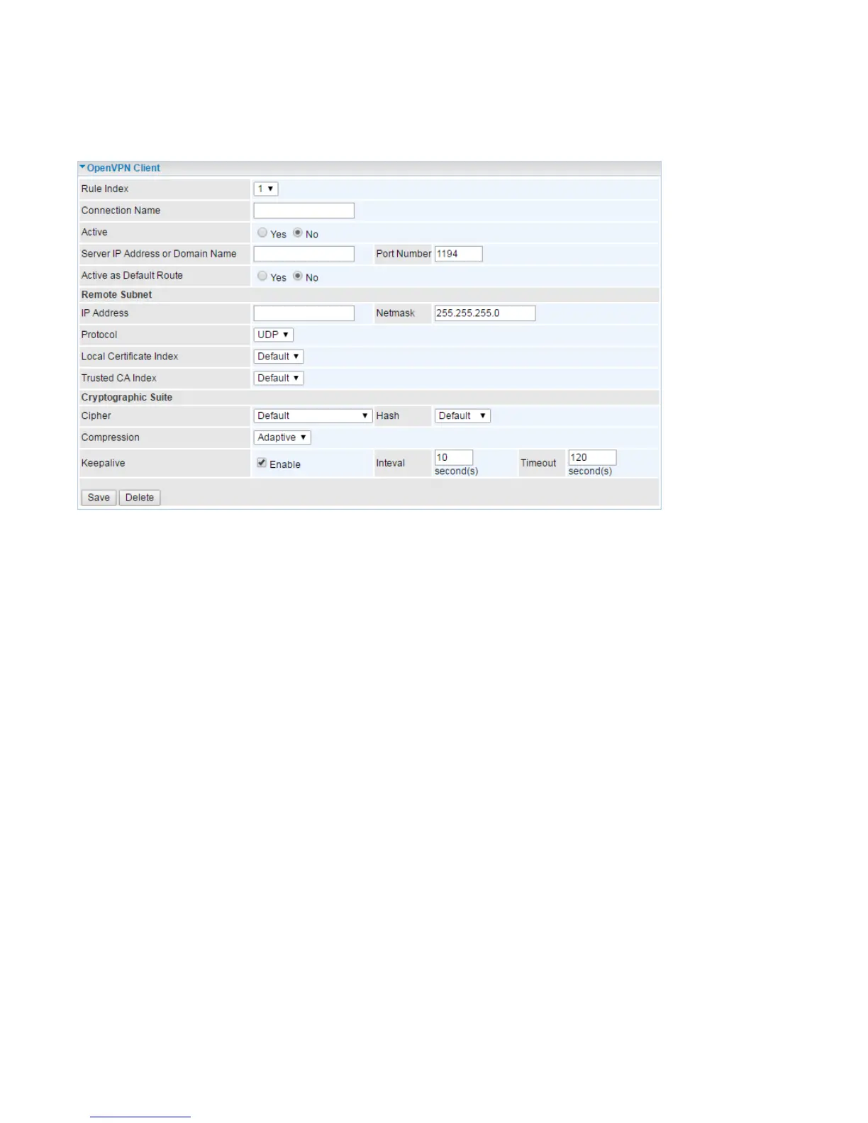 Active as Default Route: Choose Yes to let the OpenVPN tunnel/connection be the default route for