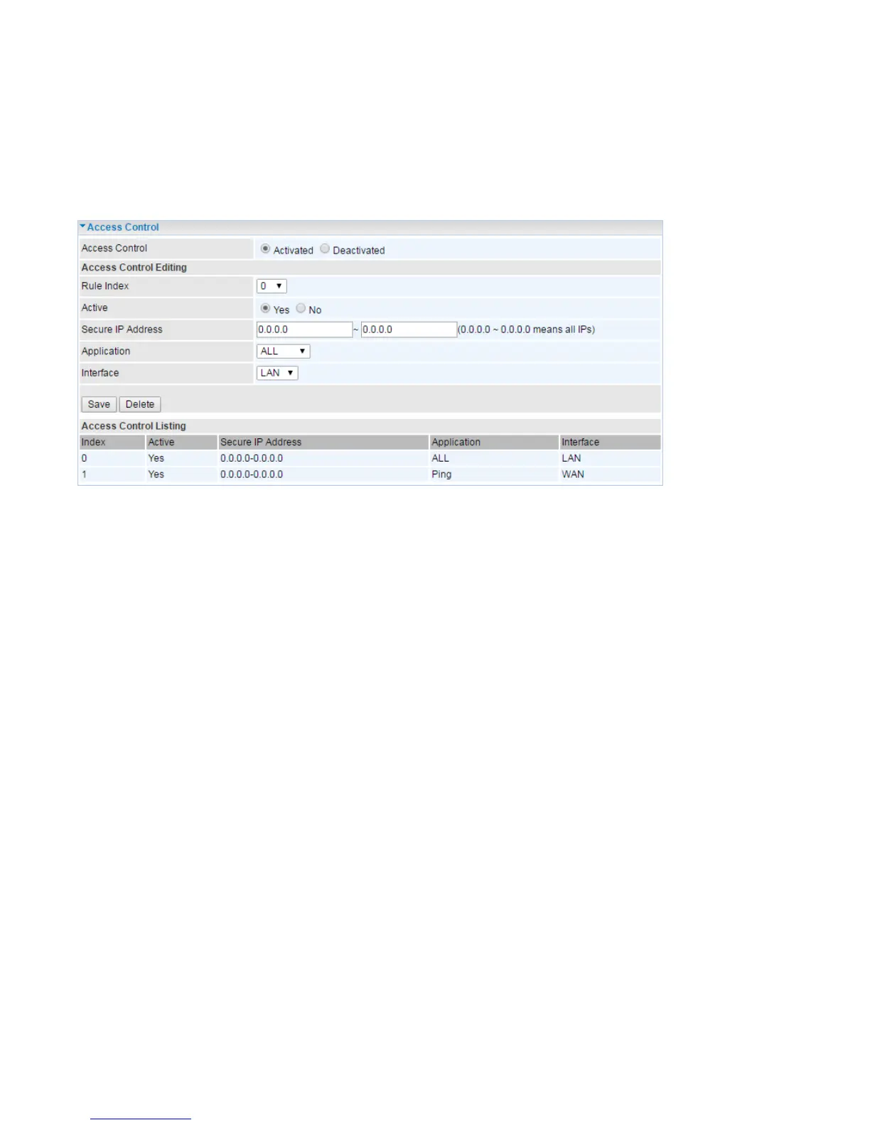 Interface: Select the access interface. Choices are LAN, WAN and Both.