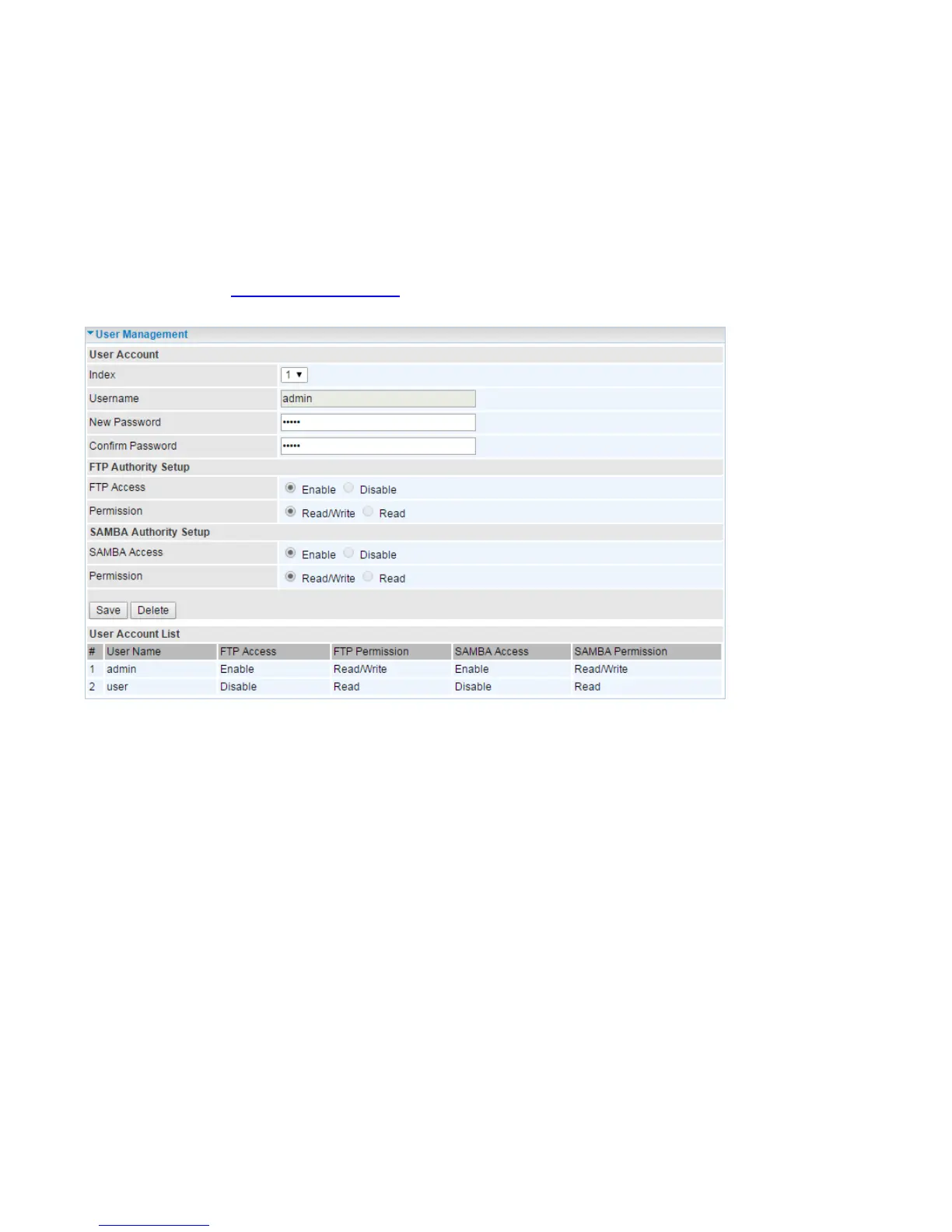 User Management controls the Router Web GUI permission, FTP/SAMBA access to the specific