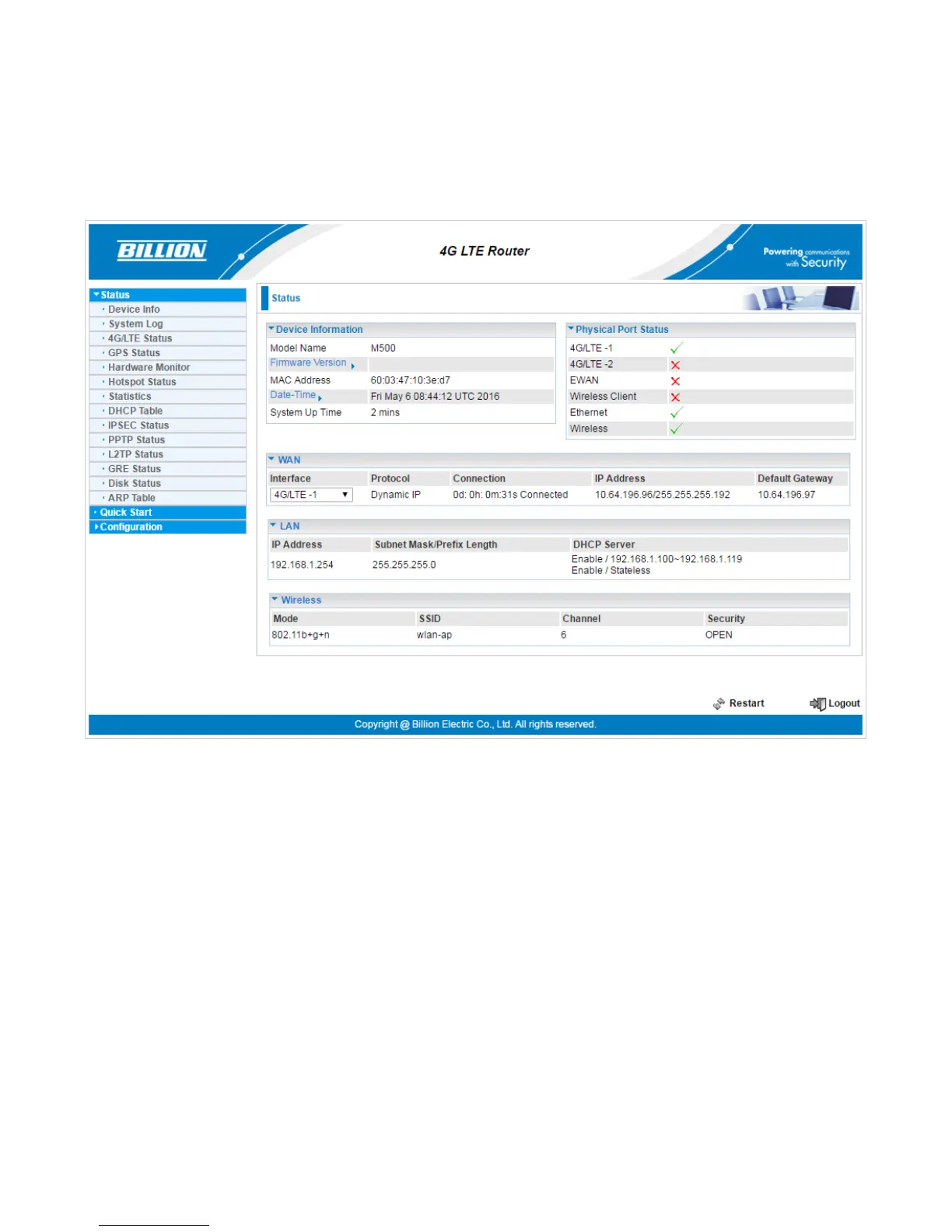 Status, GPS Status, Hardware Monitor, Hotspot Status, Statistics, DHCP Table, IPSec Status,