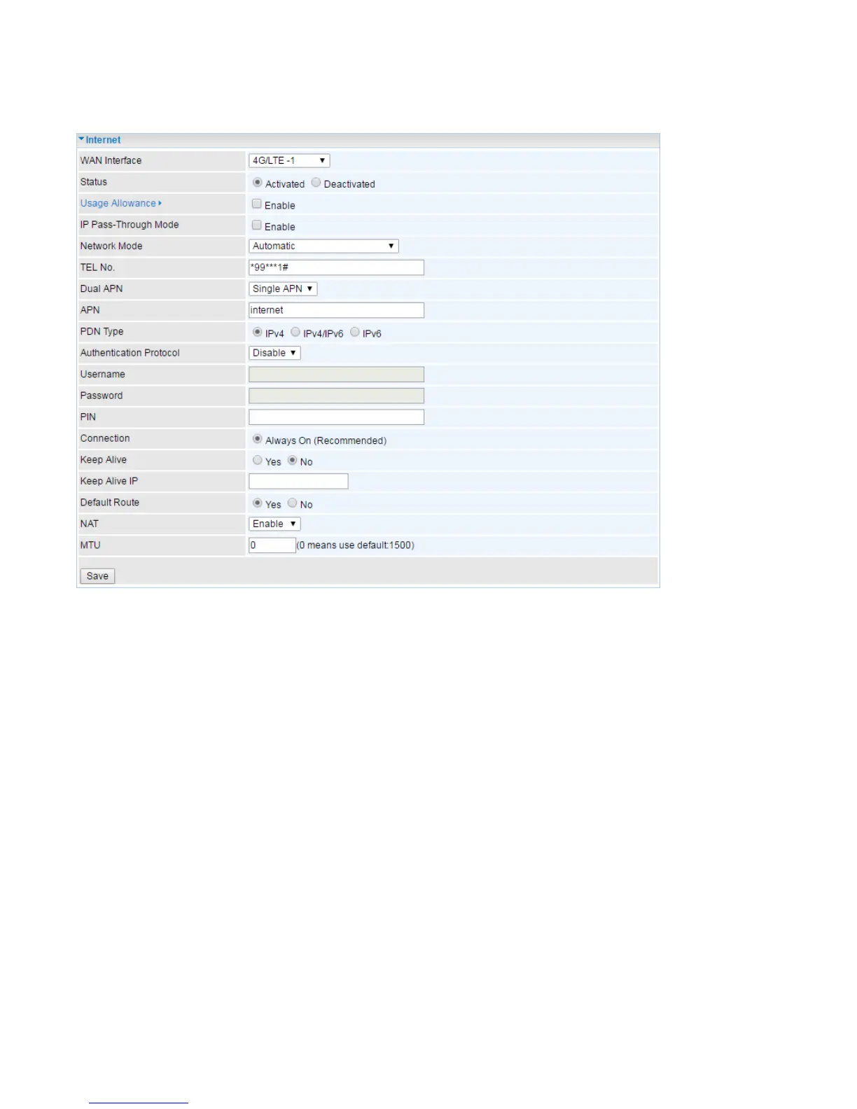 Status: Choose Activated to enable the 3G/4G-LTE connection.