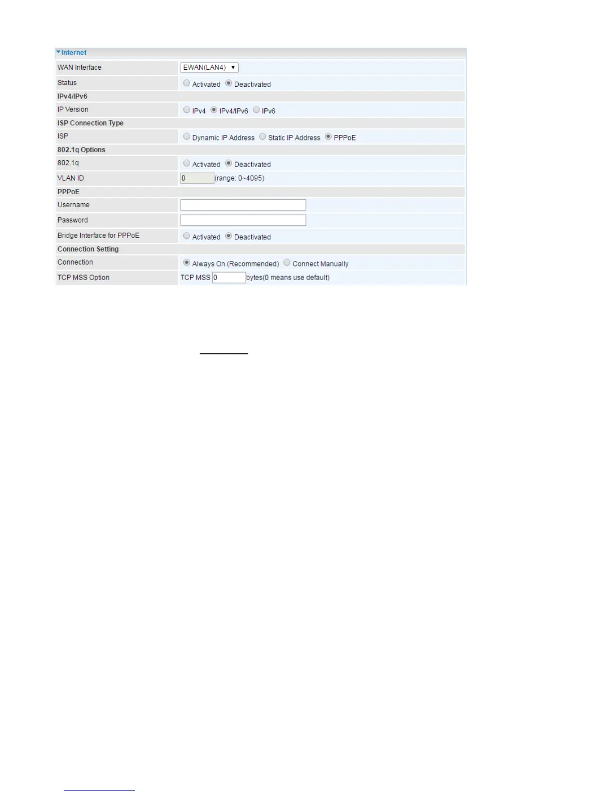 Bridge Interface for PPPoE: When “Activated”, the device will gain WAN IP from your ISP with the