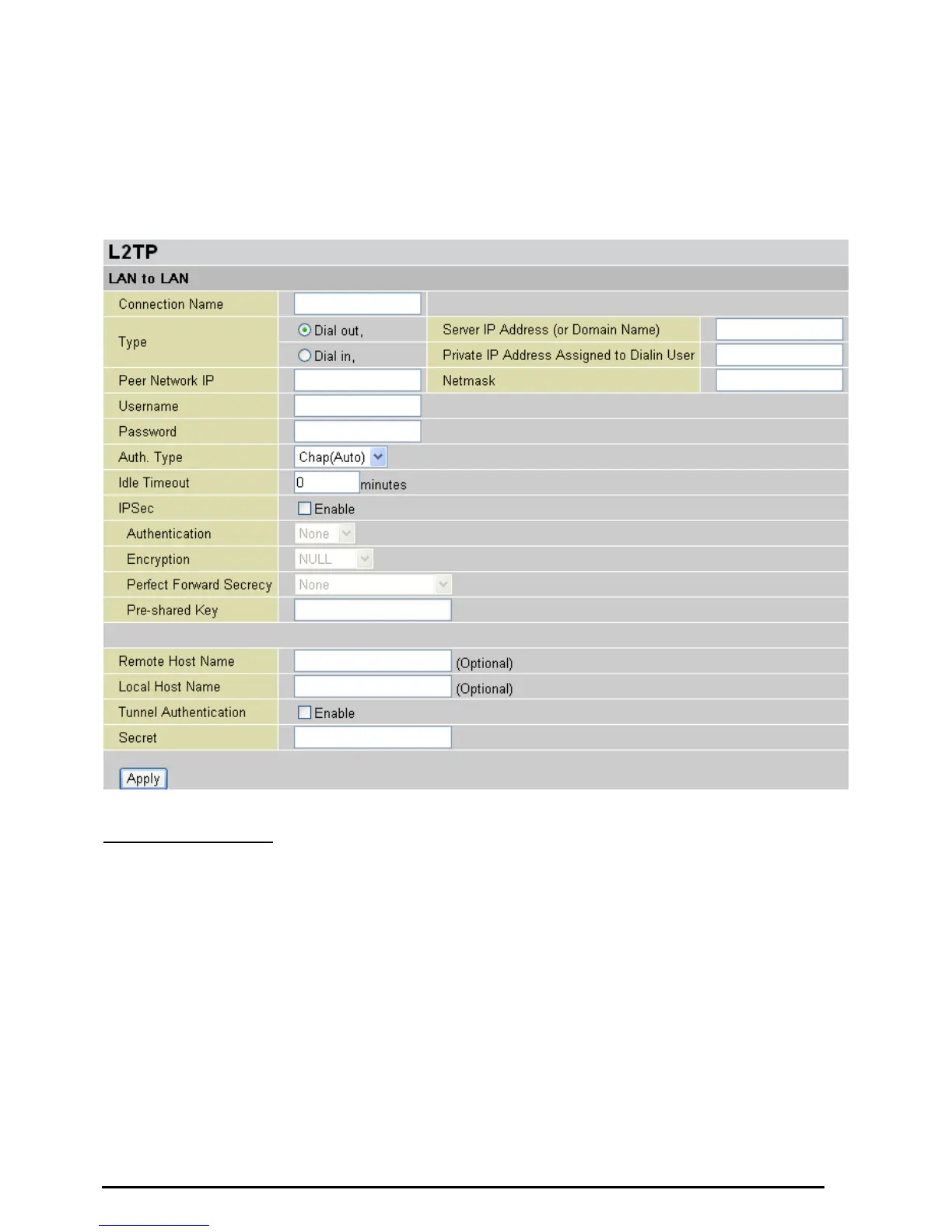 Type: Check Dial Out if you want your router to operate as a client (connecting to a remote VPN server,