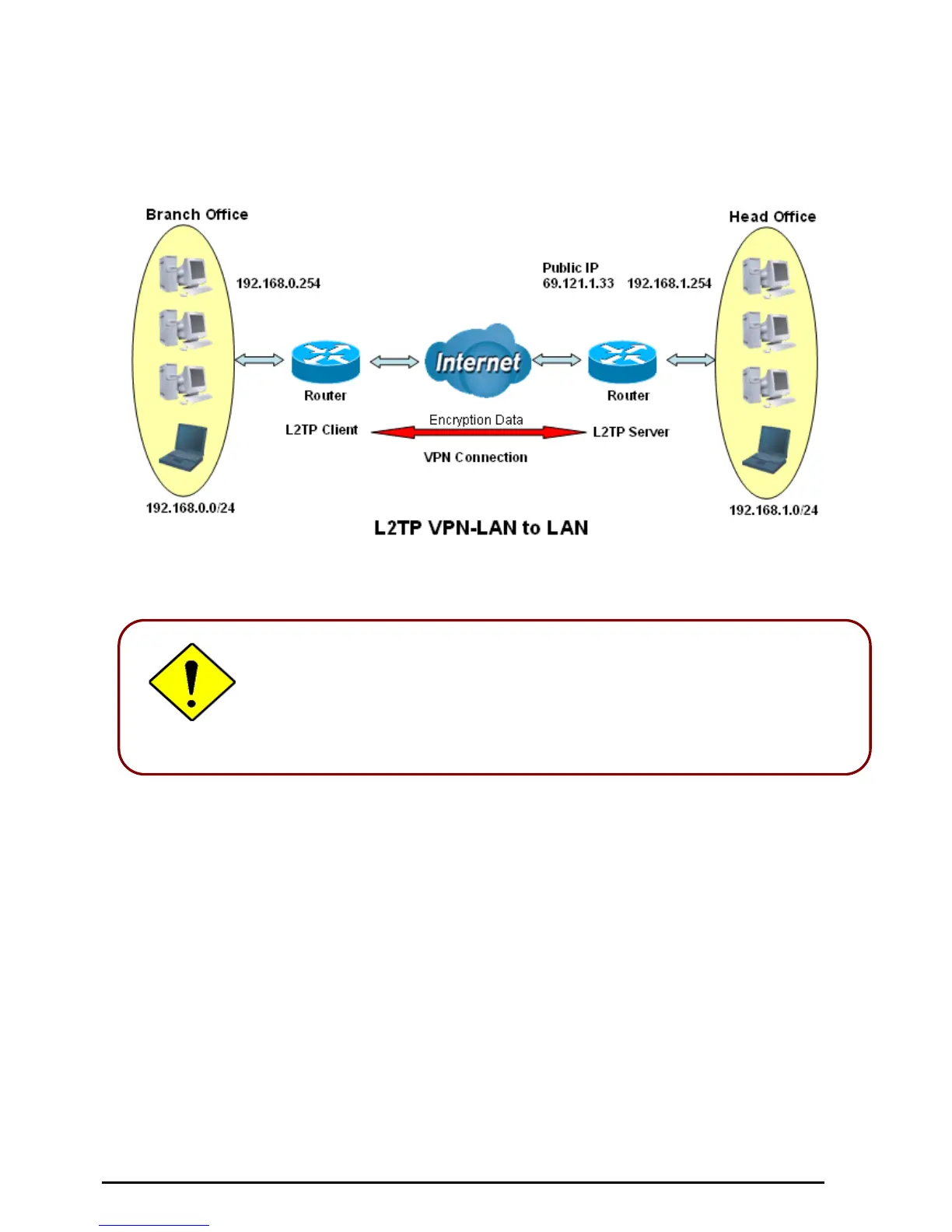 The branch office establishes a L2TP VPN tunnel with head office to connect two private networks over