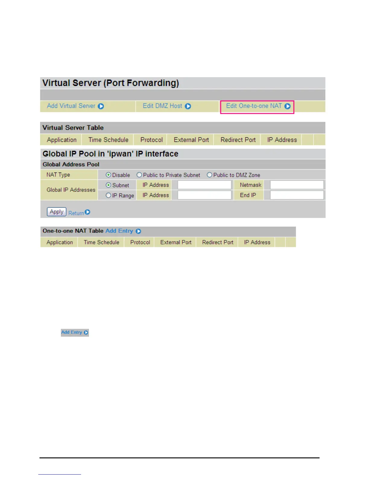 NAT Type: Select desired NAT type. As set in default setting, it disables the One-to-One NAT function.