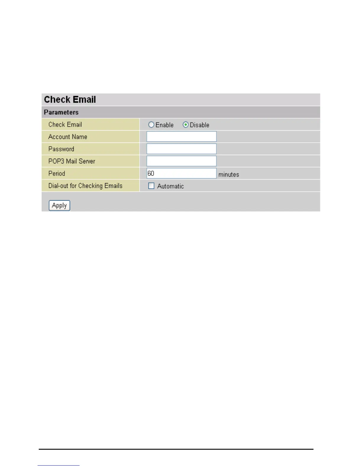 This function allows you to have the router check your POP3 mailbox for new Email messages. The Mail
