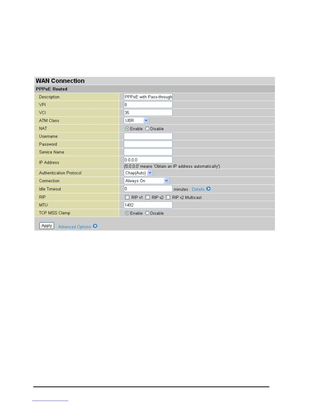 Authentication Protocol: Default is Chap (Auto). Your ISP will advise you whether to use Chap or Pap.