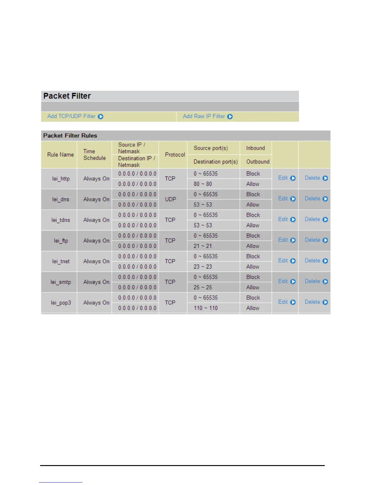 accordingly to the level of Firewall, which is selected. See Table1: Predefined Port Filter for more