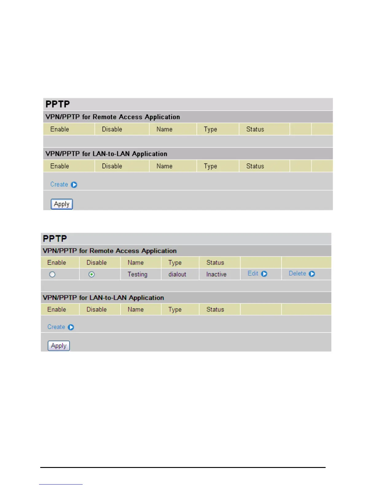 There are two types of PPTP VPN supported; Remote Access and LAN-to-LAN (please refer below for