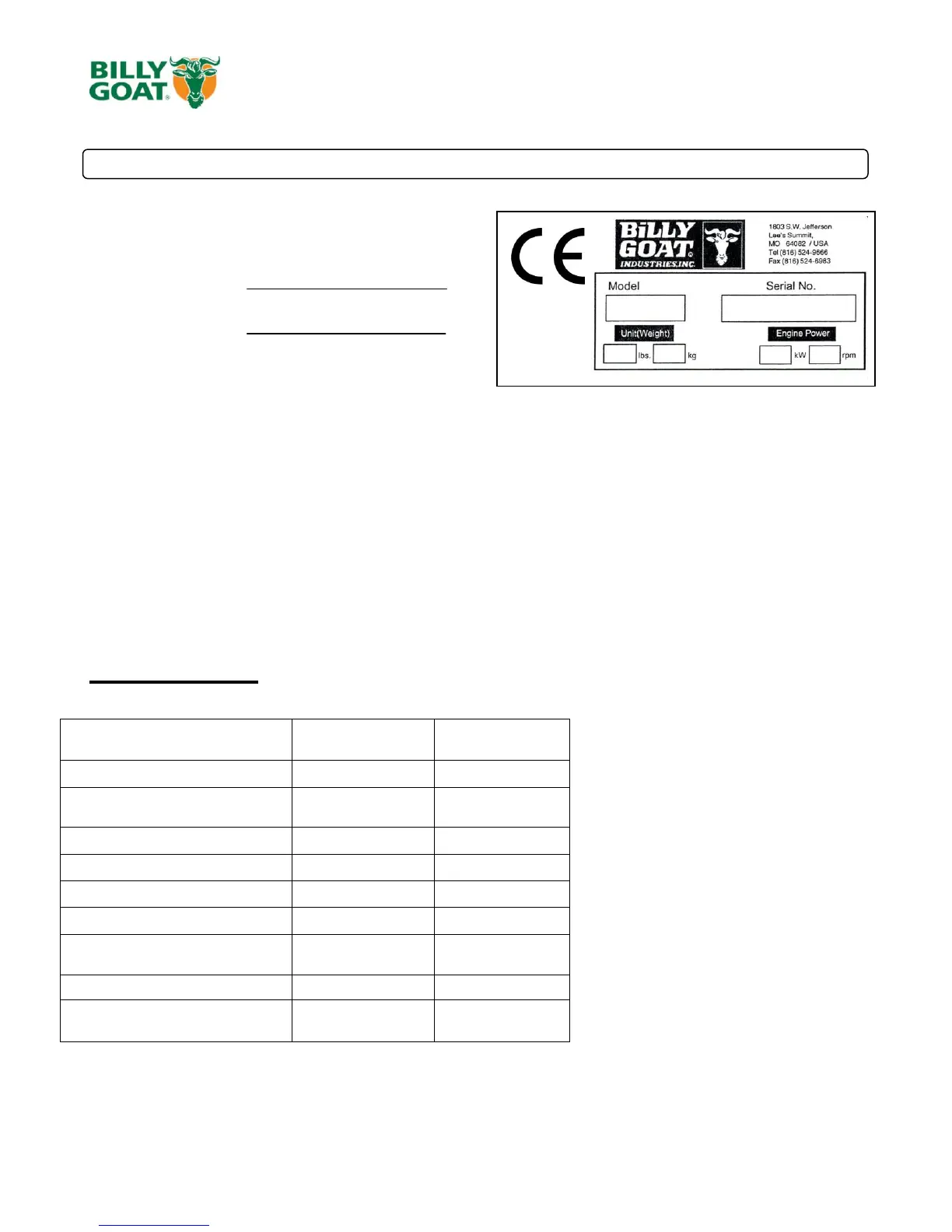 Billy Goat OS900SPS - Serial Plate Data and Specifications