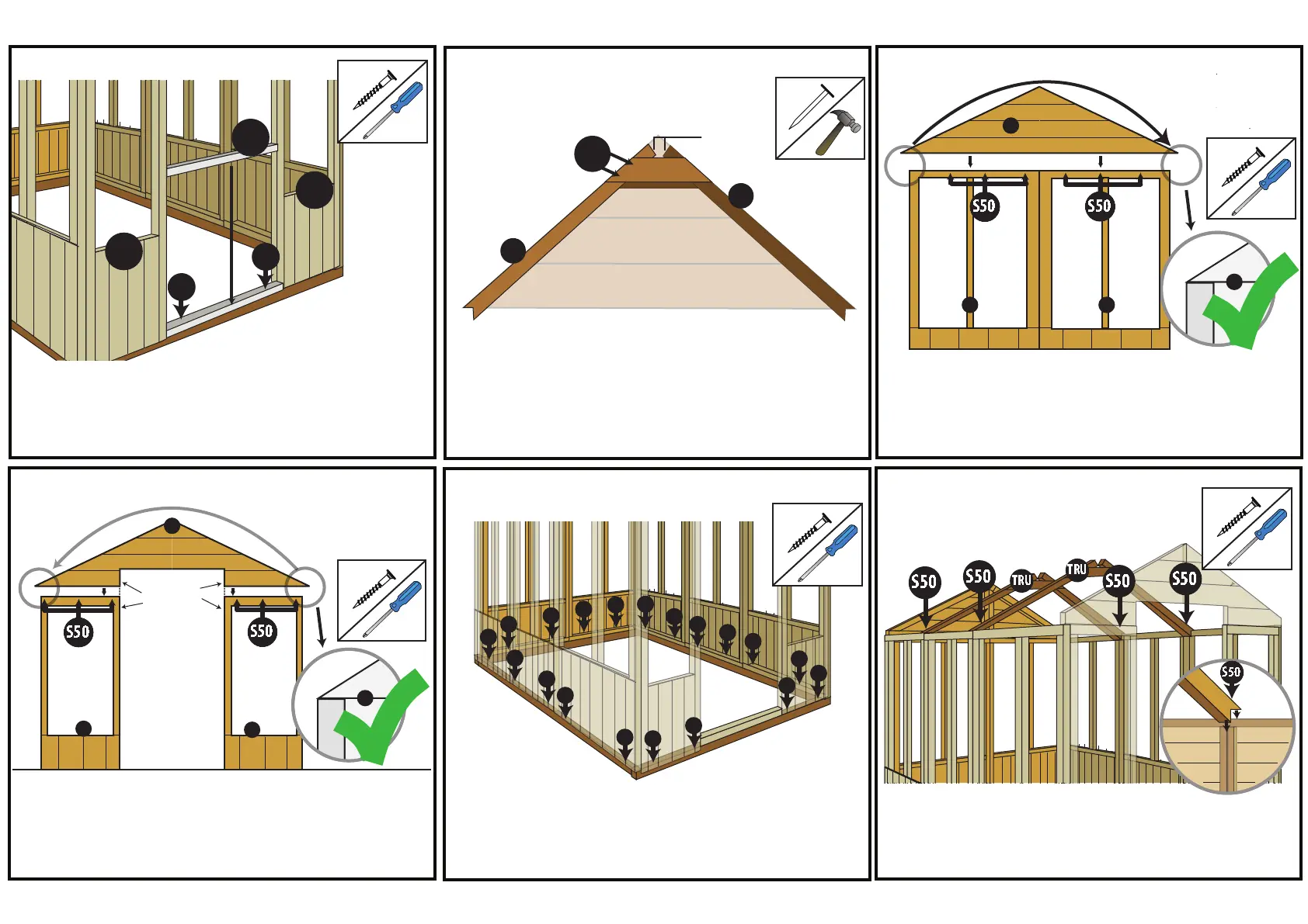 3) Fix the GABLE APEX (GA) to the top of the WINDOW PANELS (WP) with 50mm screws (S50)