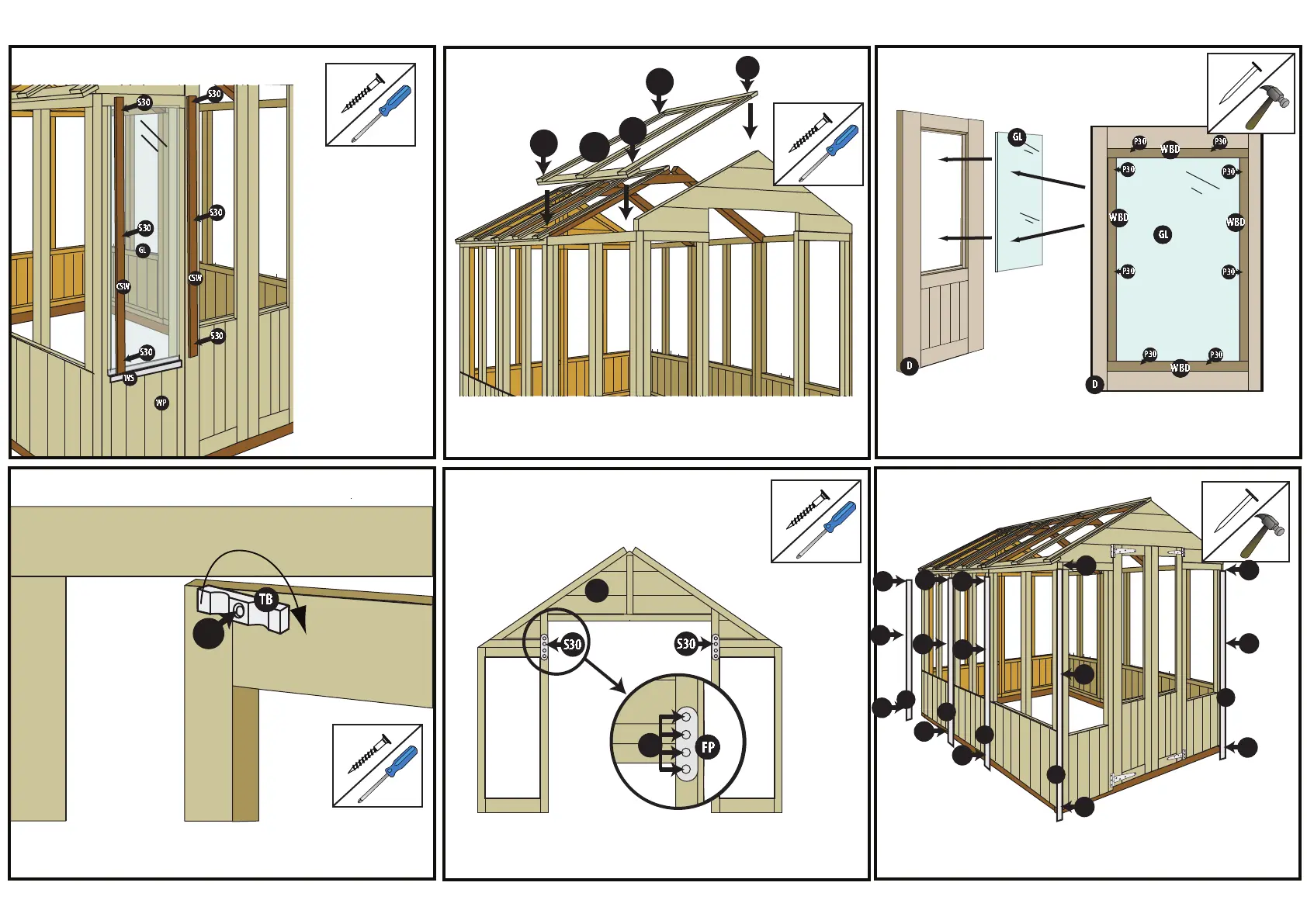 Use 30mm screws to x a FIXING PLATE (FP) to each of the uprights on the DOOR GABLE