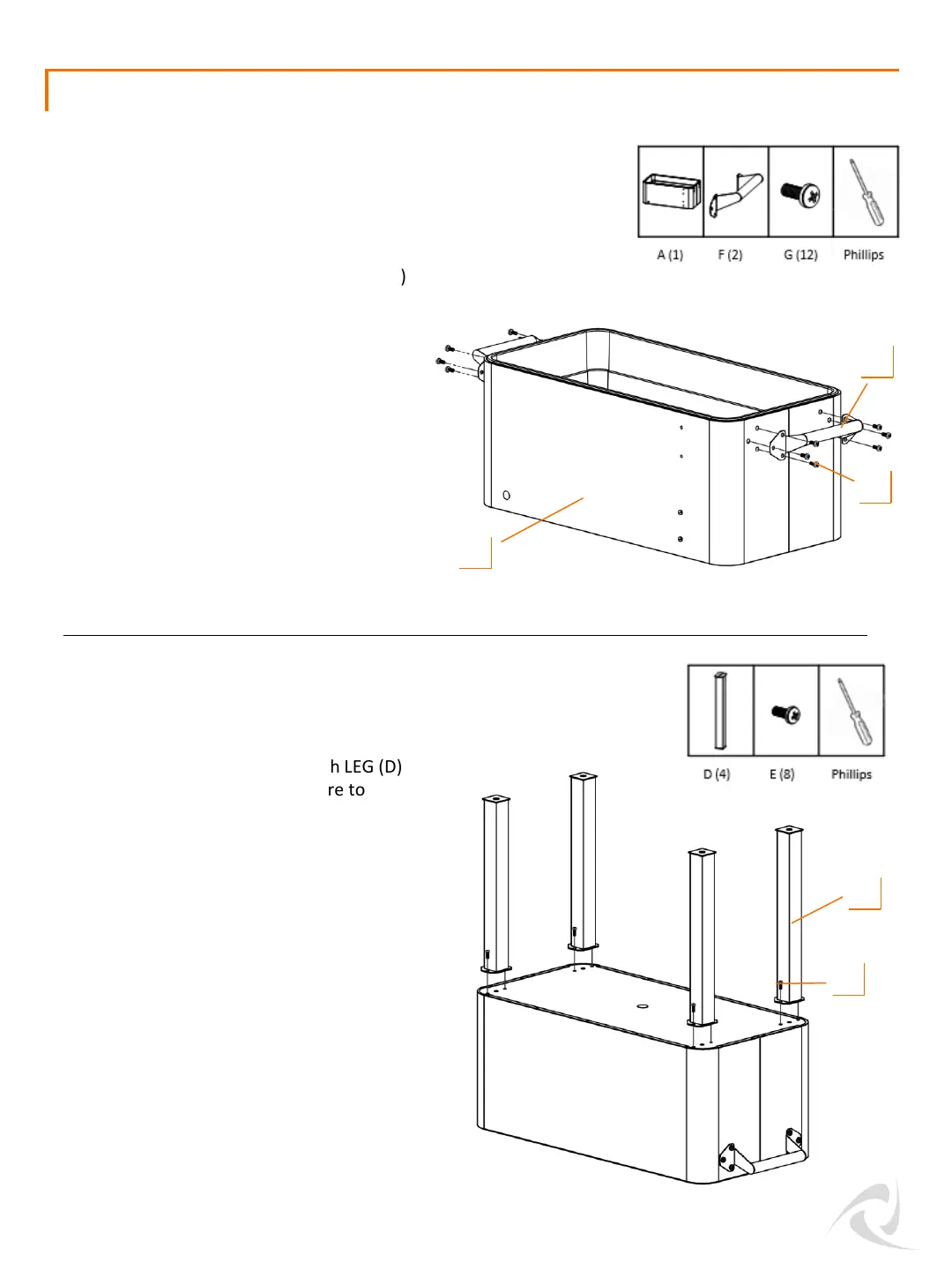 holes on bottom of TUB (A). Attach LEG (D)