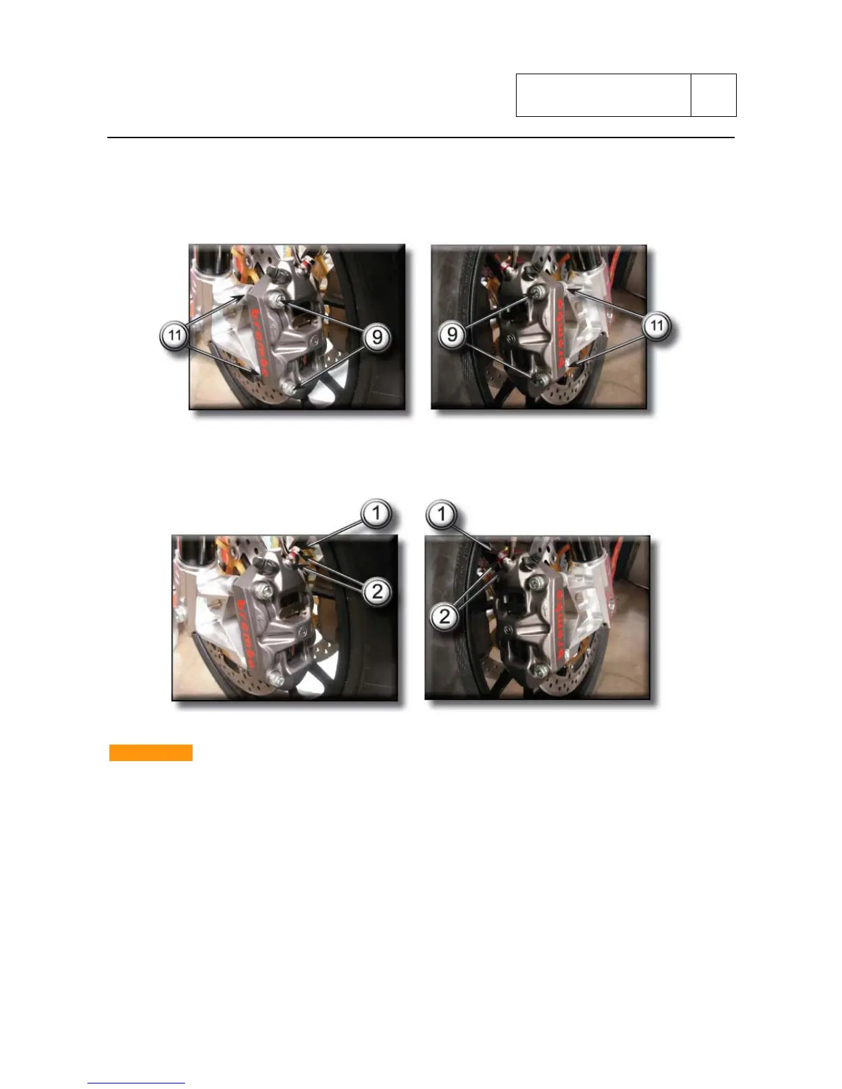 Unscrew the four retaining bolts (9) securing the front calipers to the fork legs.
