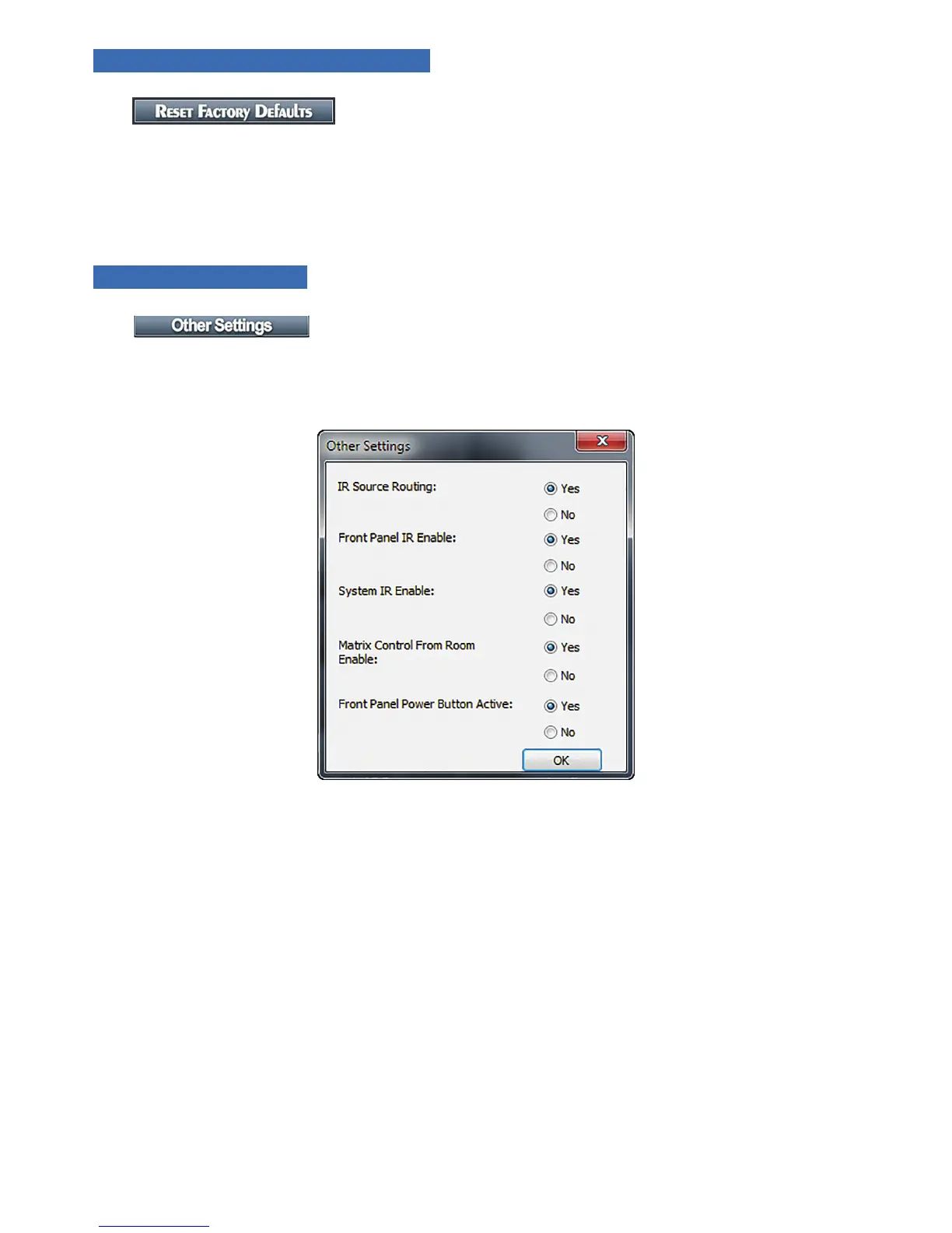 Routing to Yes for this functionality (default). If set to No, the IR coming from a room is routed to the IR output
