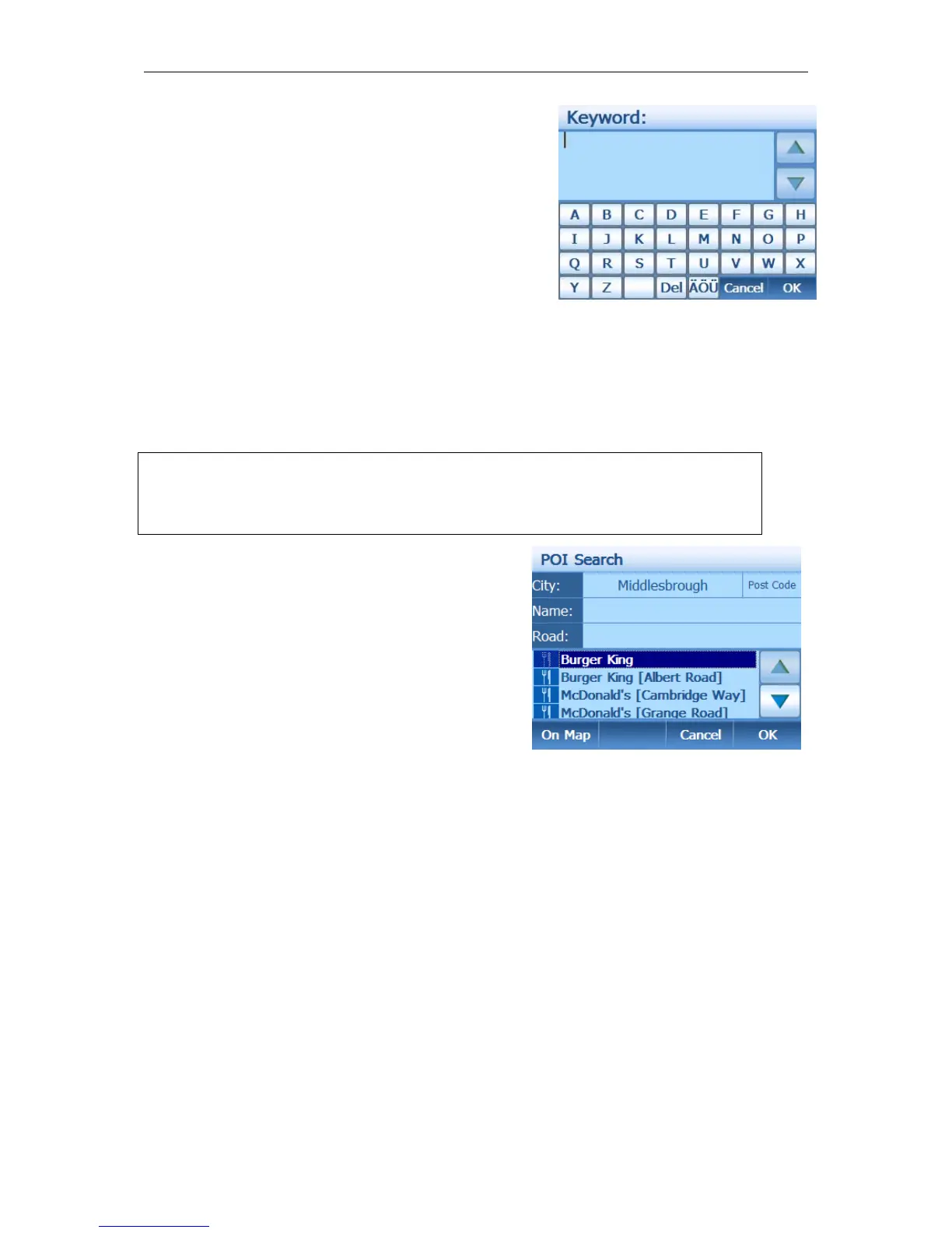 You can also enter a road to search for POI along. The unit will search for the road in