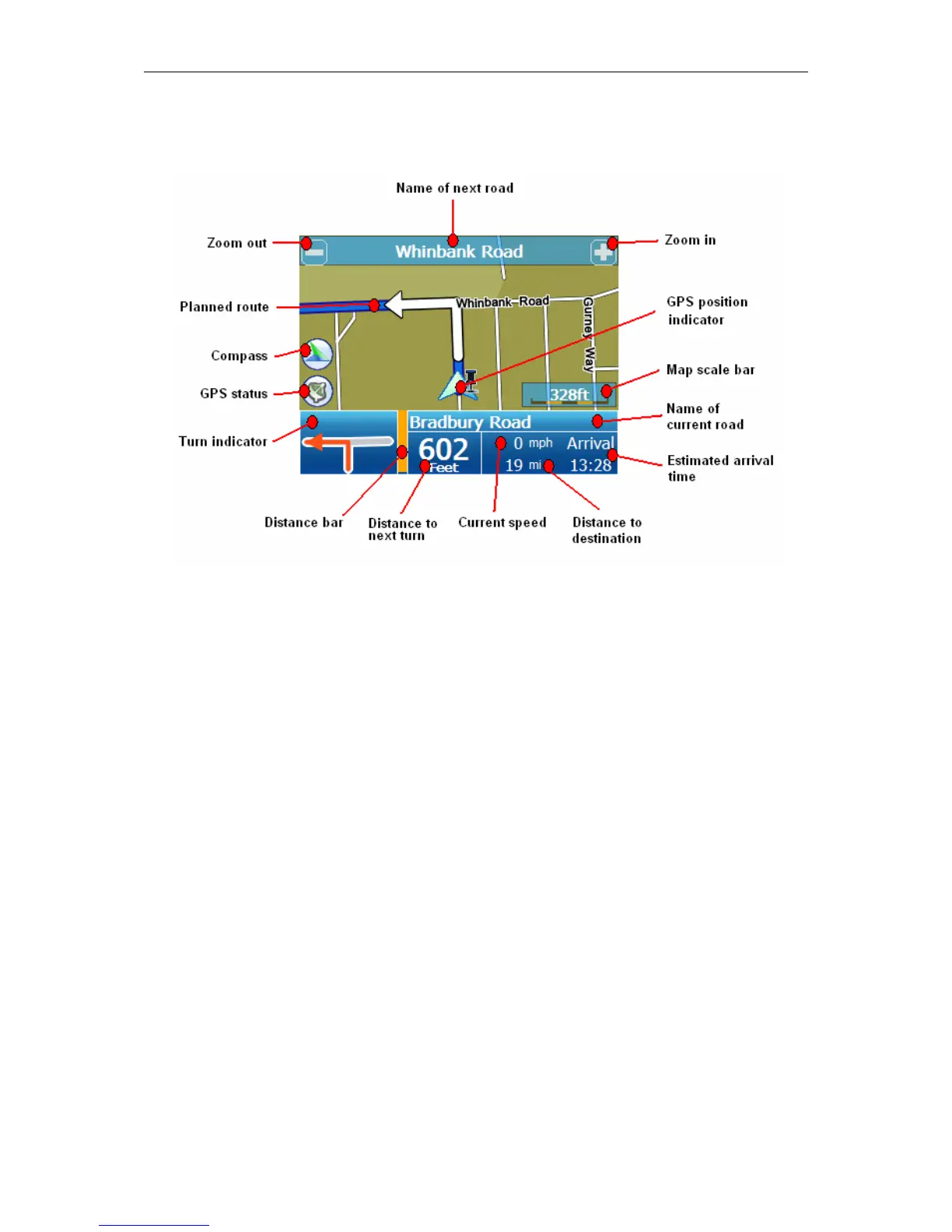Planned route – Shows the route ahead which has been calculated by the unit.