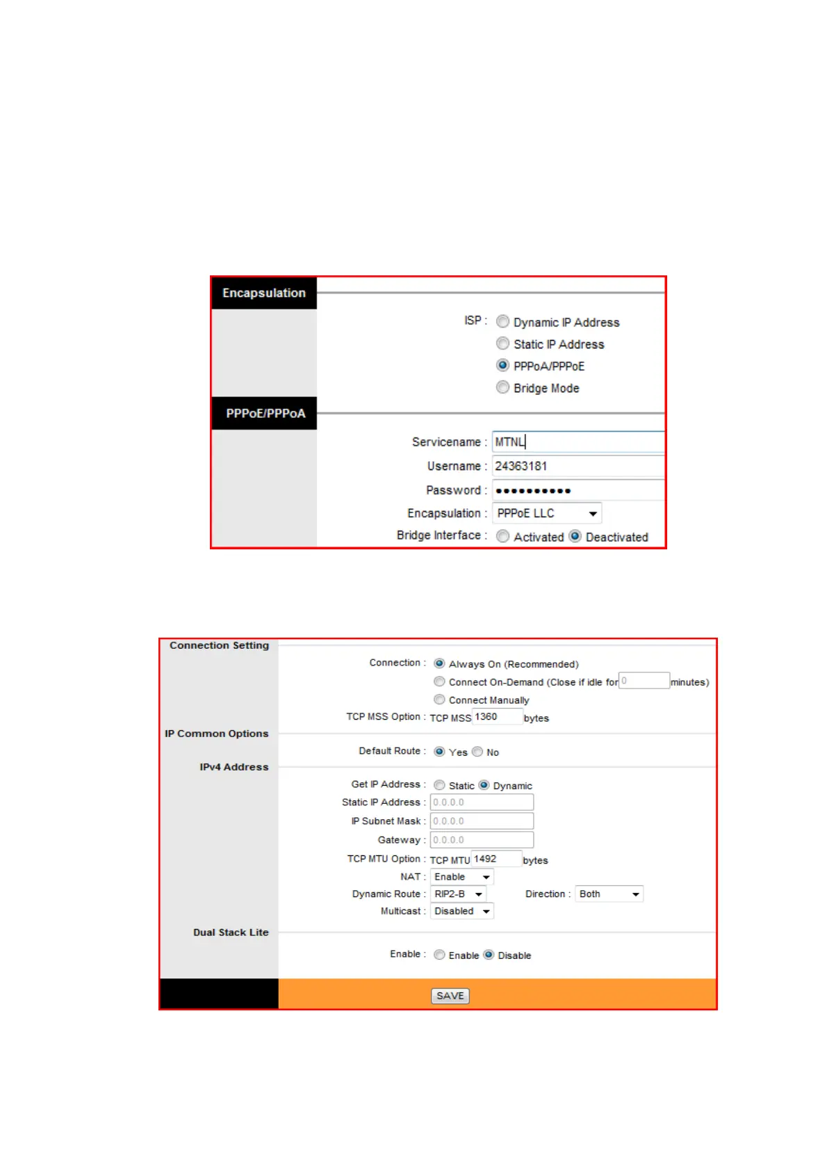f. Under PPPoE/PPPoA enter the service name as MTNL, Username as the
