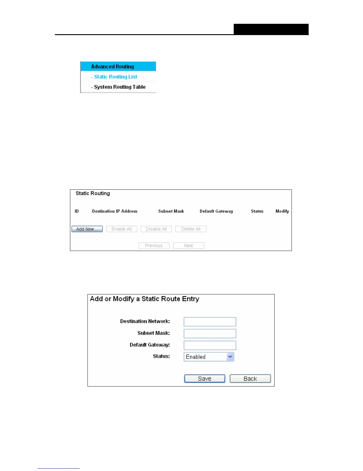 Choose menu “Advanced Routing → Static Routing List”, and you can configure the static