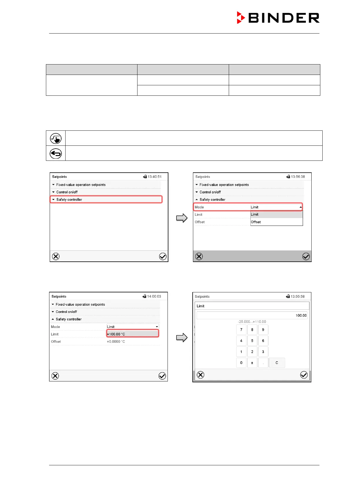 Temperature set point Safety controller mode Safety controller set-point