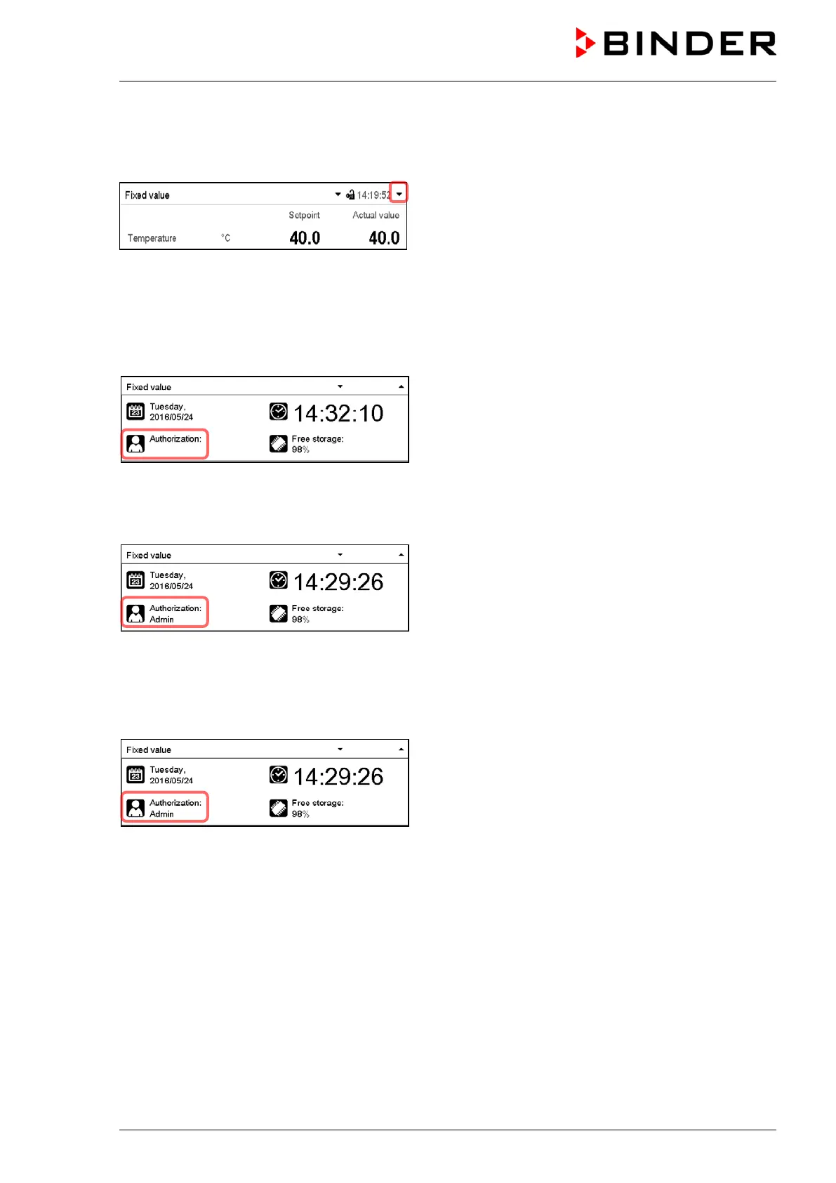 To check the authorization level of the user currently logged-in, select in Normal display the arrow far right