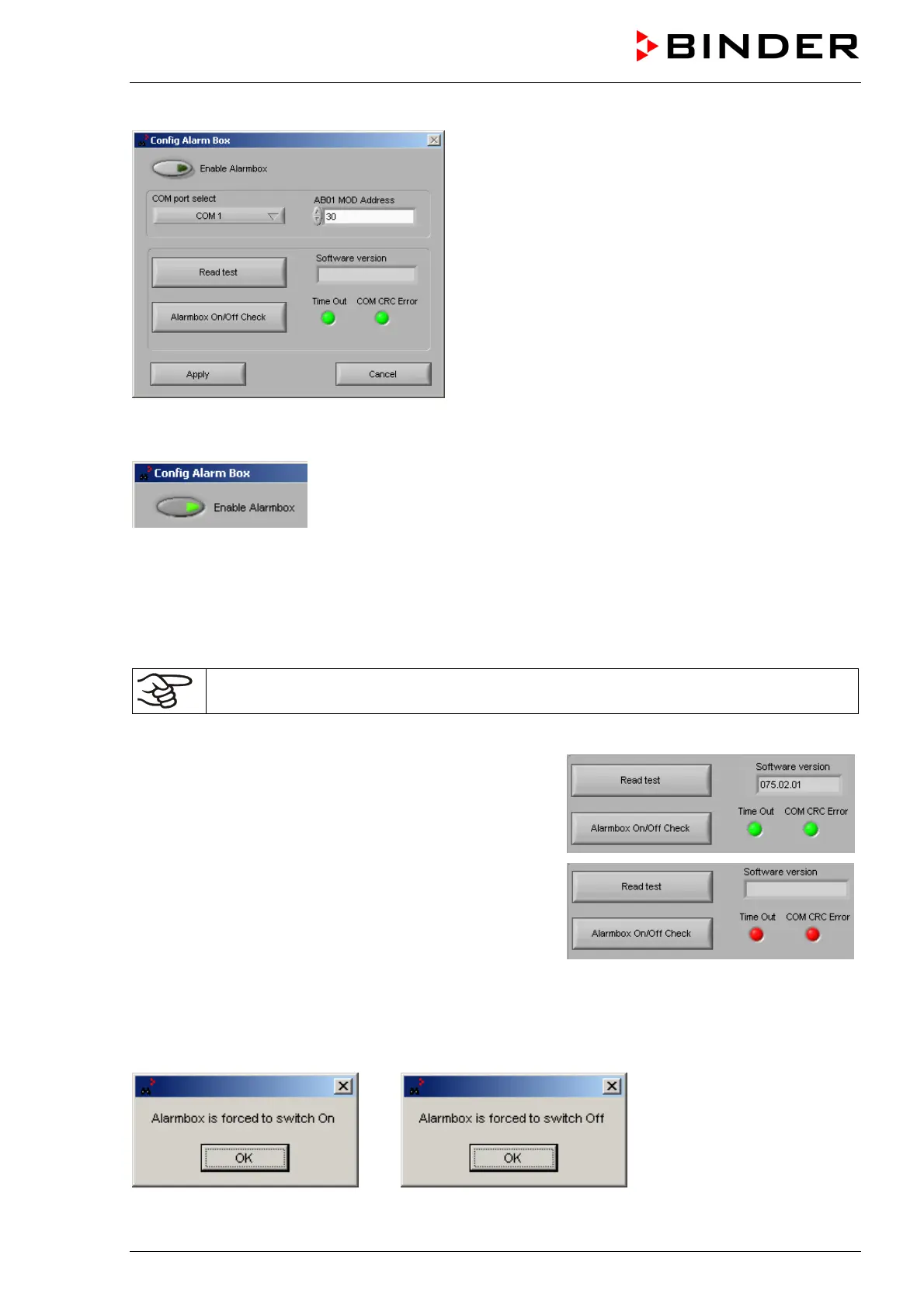 The button “Alarmbox On/Off Check” permits manually switching on and off the alarm pilot lamp of the