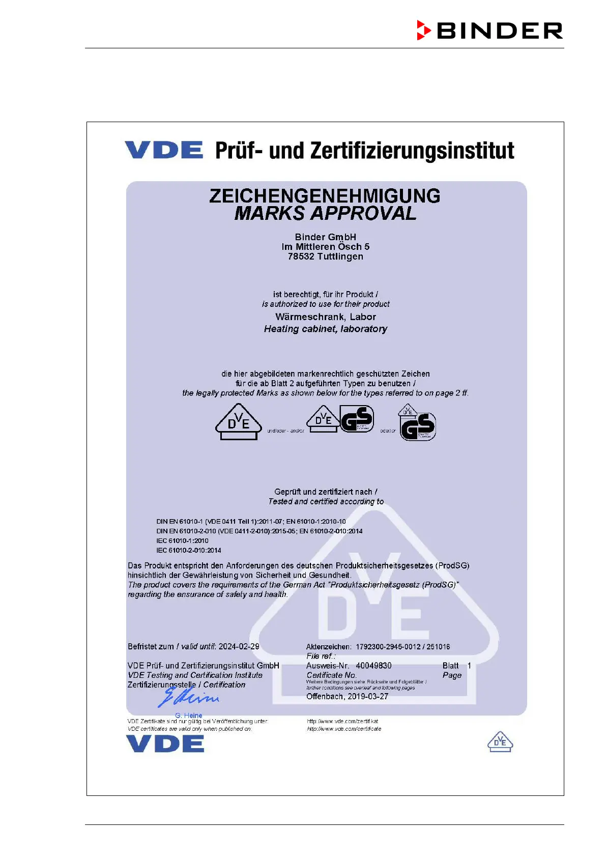 17.4 Certificate for the GS mark of conformity of the “VDE Prüf- und Zertifizier-
