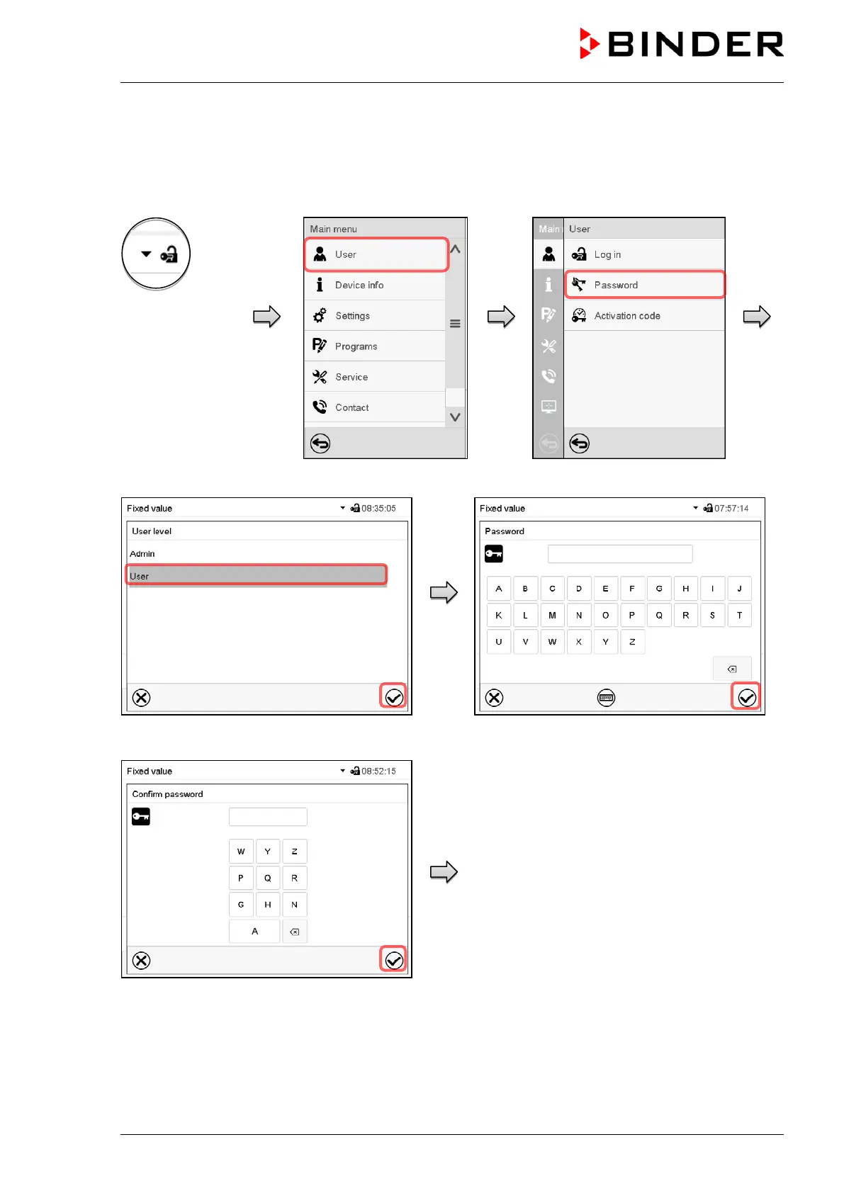 password” screen. Press the Confirm icon.