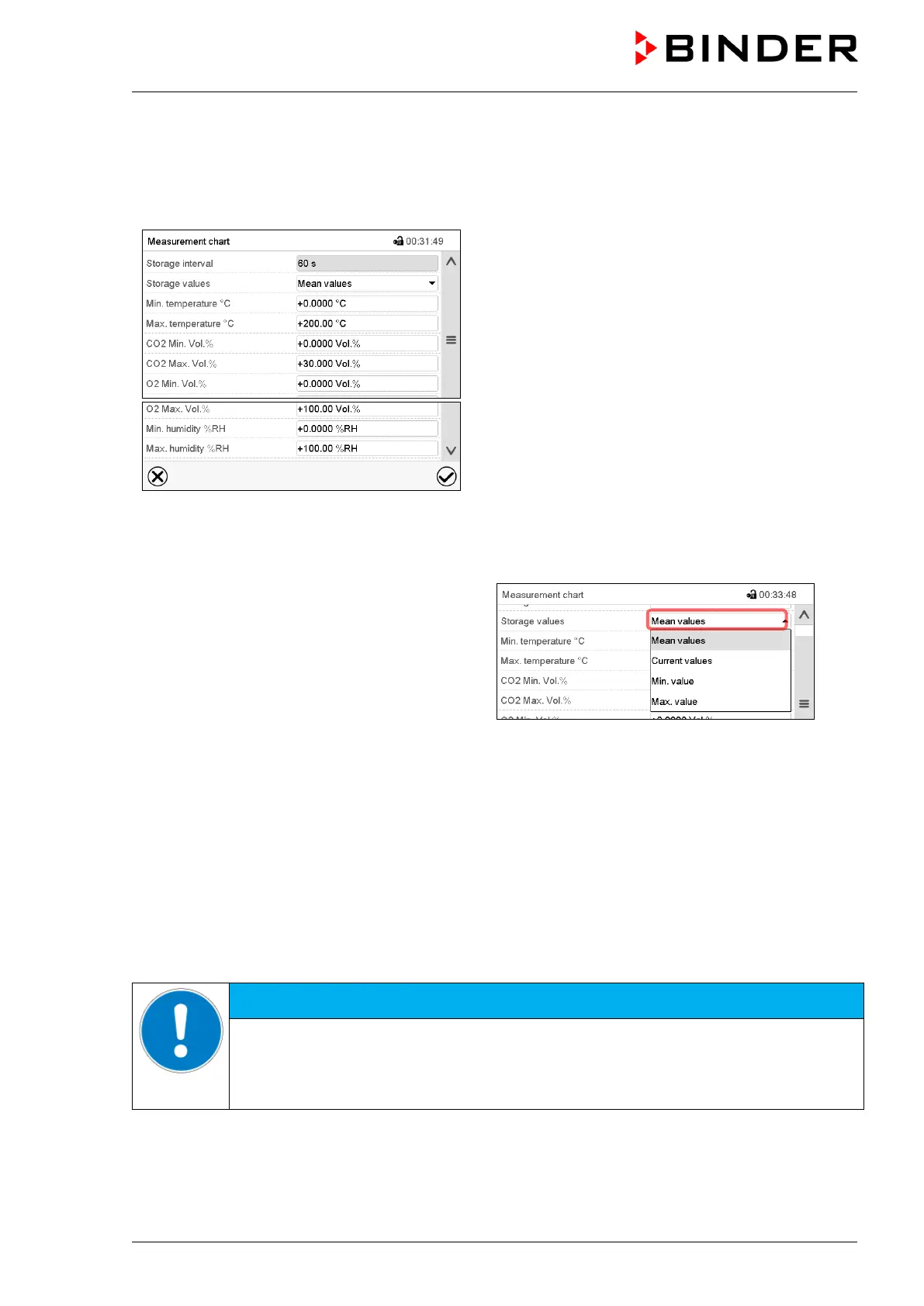 • Select the field “Storage interval” and enter the desired storage interval. Confirm entry with Confirm icon.