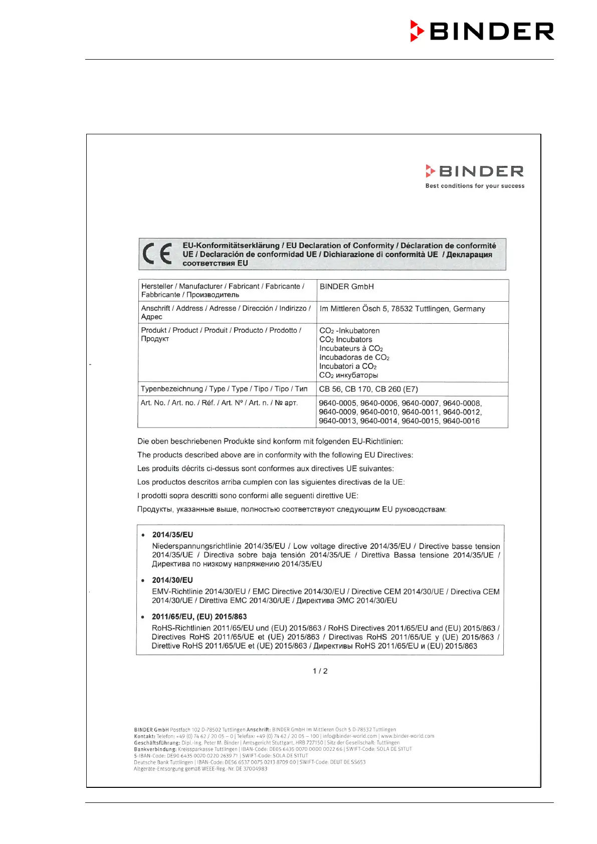 Binder CB260-230V-O - Certificates and Declarations of Conformity; EU Declaration of Conformity for CB