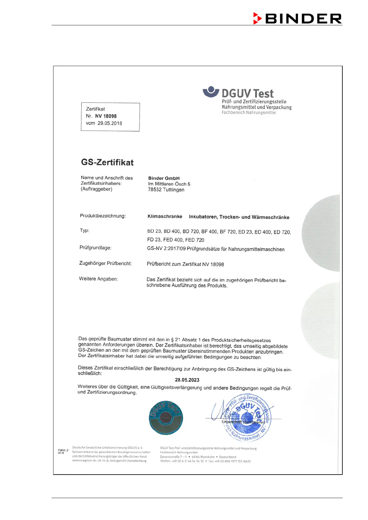 Binder FD240-230V - Certificate for the GS Mark of Conformity of the Deutsche Gesetzliche Unfallversicherung E.V. (German Social Accident Insurance) DGUV