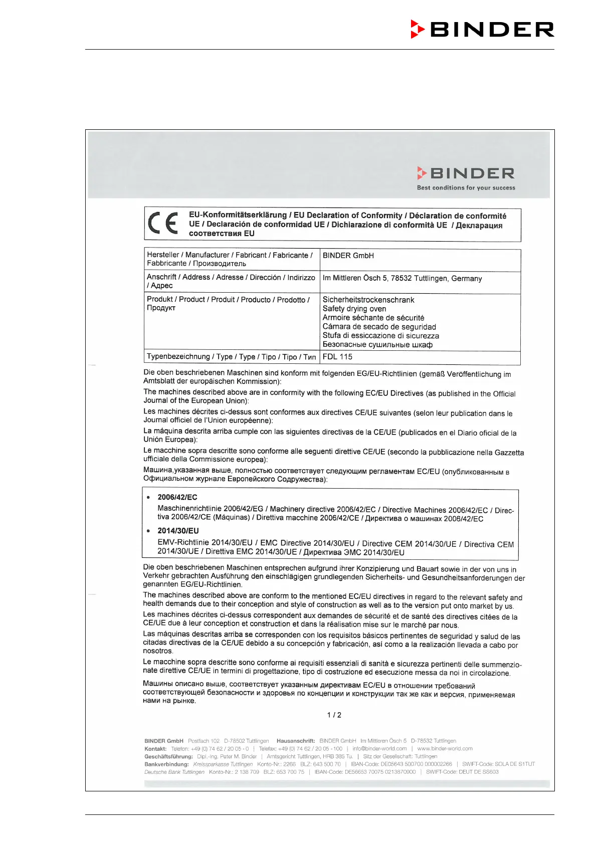 Binder FDL 115 - 18 Certificates and Declarations of Conformity; EU Declaration of Conformity