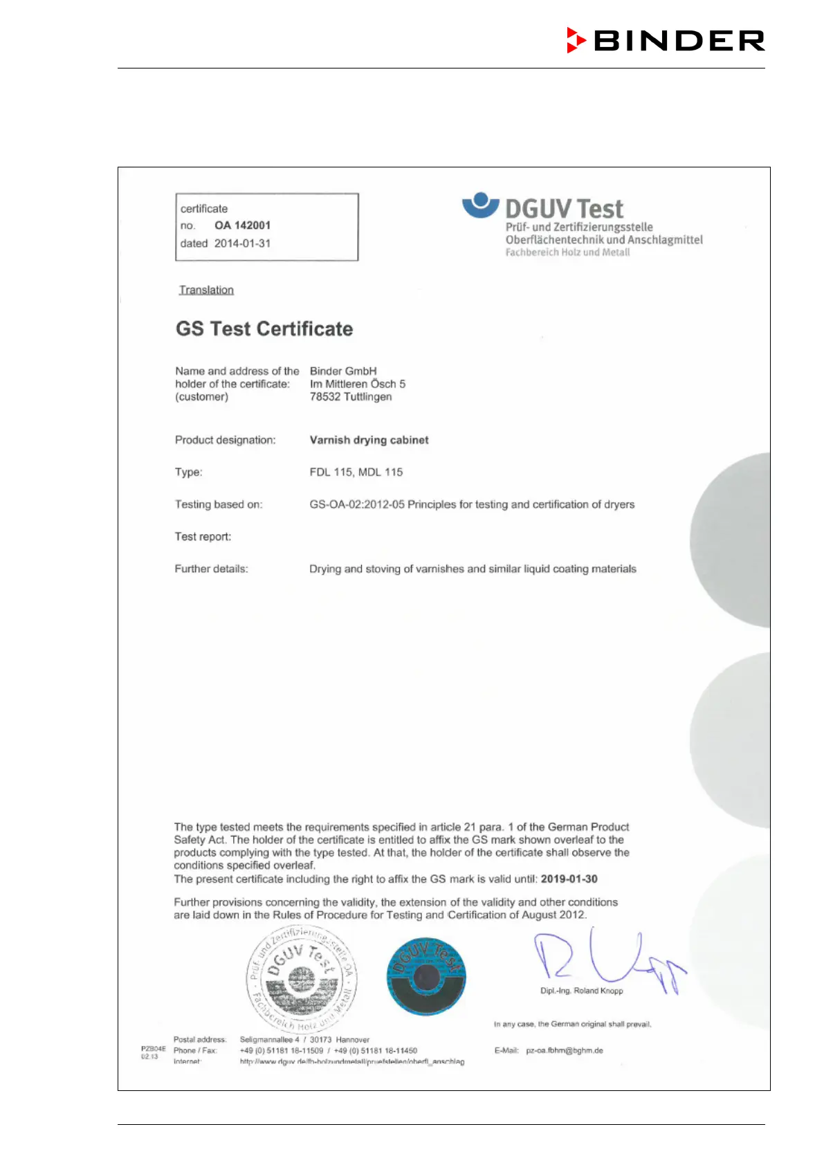 Binder FDL 115 - Certificate for the GS Mark of Conformity of the Deutsche Gesetzliche Unfallversicherung E.V. (German Social Accident Insurance (DGUV)