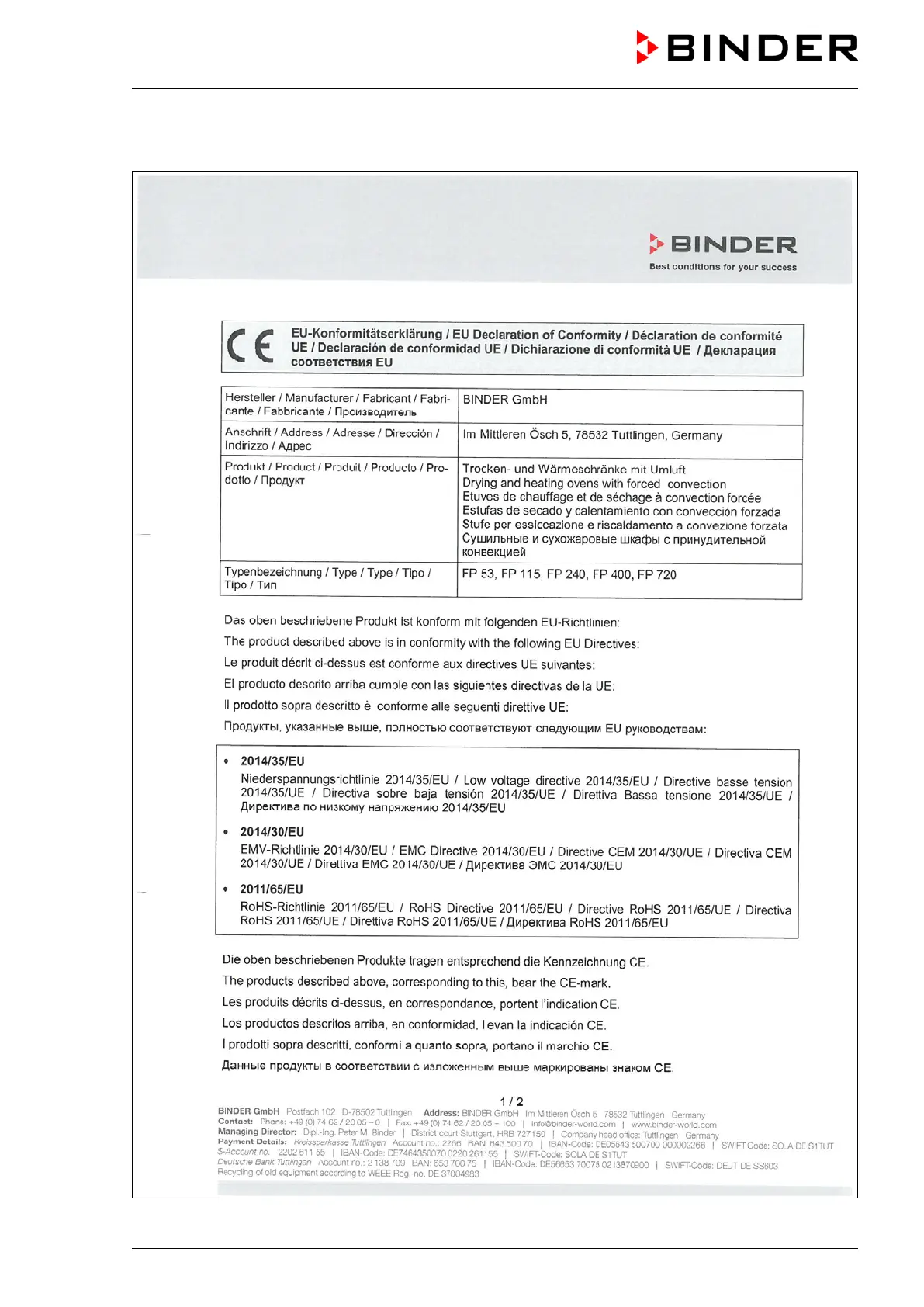 Binder FP 53 - 20 Eu Declaration of Conformity