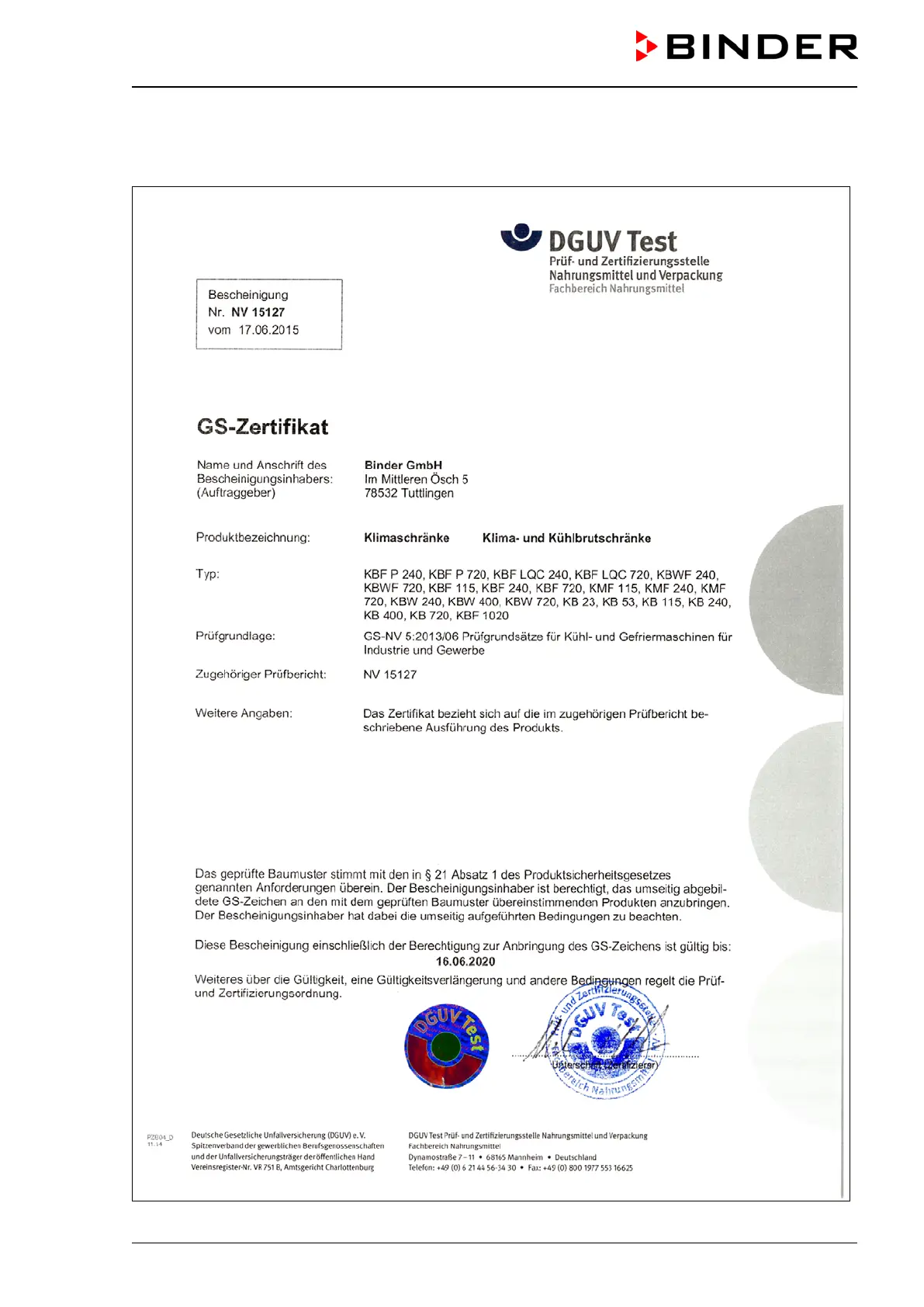 Binder KB 115 (E4) - Certificate for the GS Mark of Conformity of the Deutsche Gesetzliche Unfallversicherung E.V. (German Social Accident Insurance) DGUV