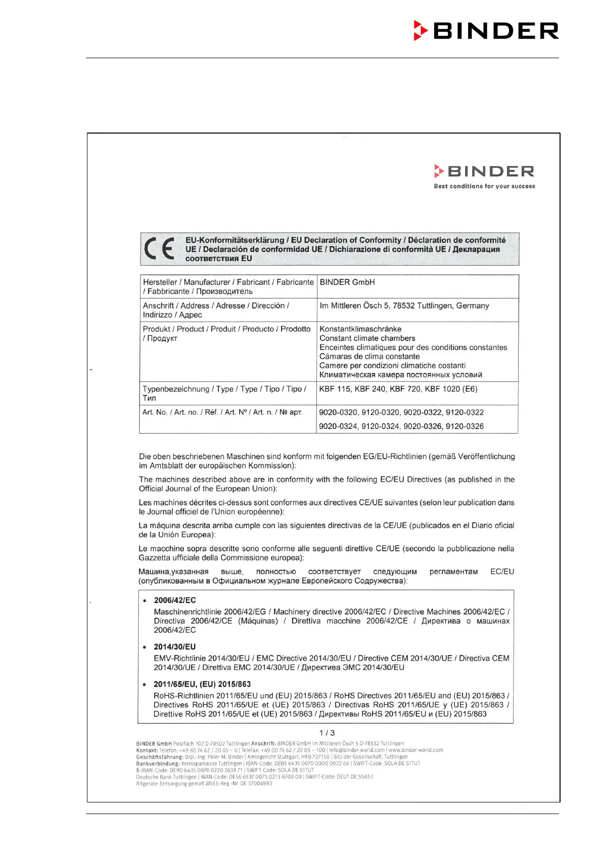 Binder KBF 240 - Certificates and Declarations of Conformity; EU Declaration of Conformity for KBF