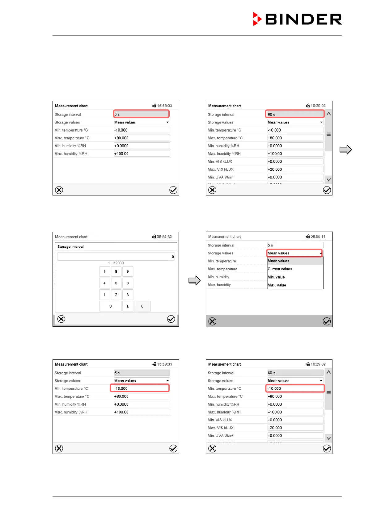 This menu allows setting the storage interval, the type of values to be shown and the scaling of the tem-