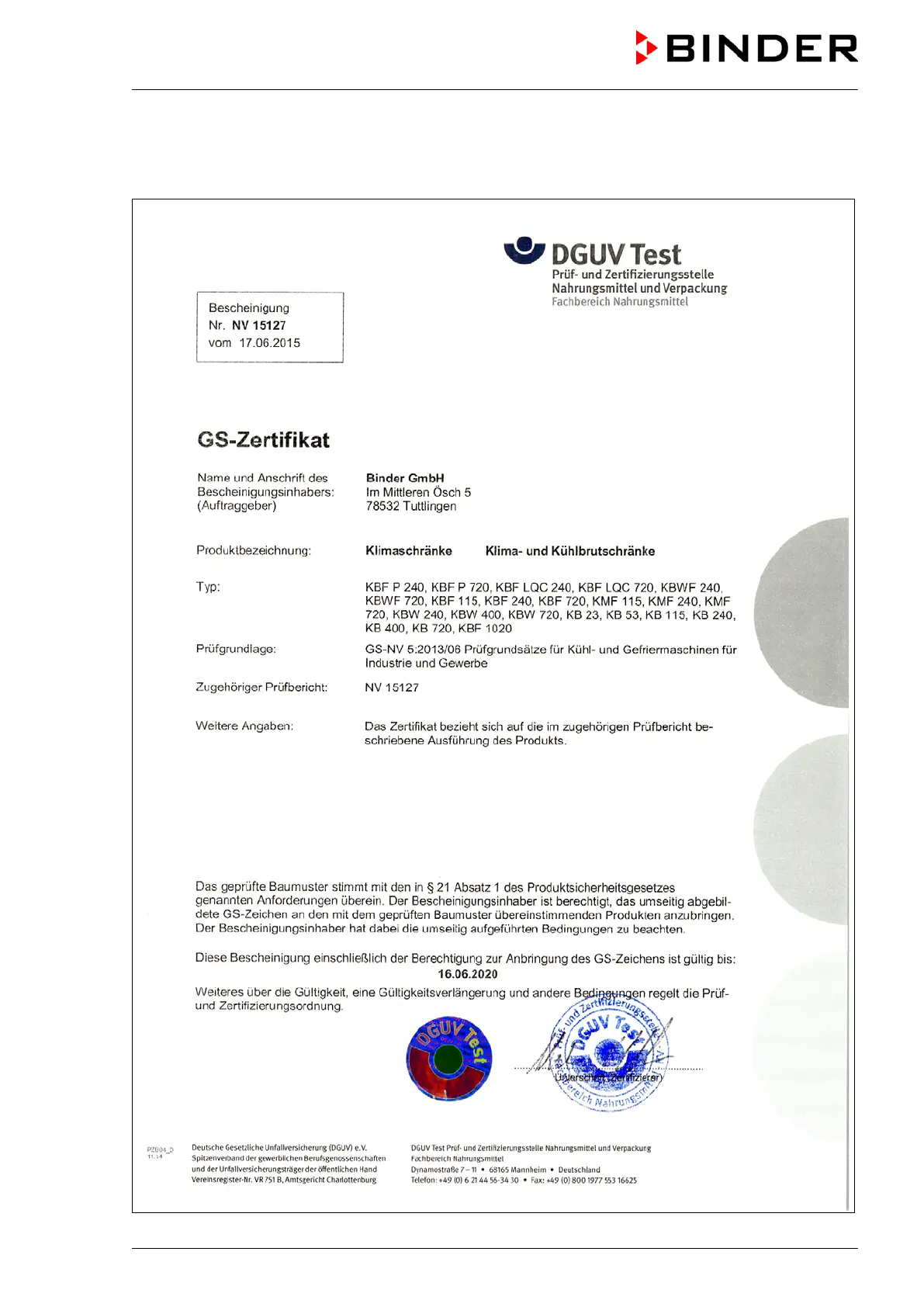 Binder KBF P 240 - Certificate for the GS Mark of Conformity of the Deutsche Gesetzliche Unfallversicherung E.V. (German Social Accident Insurance) DGUV