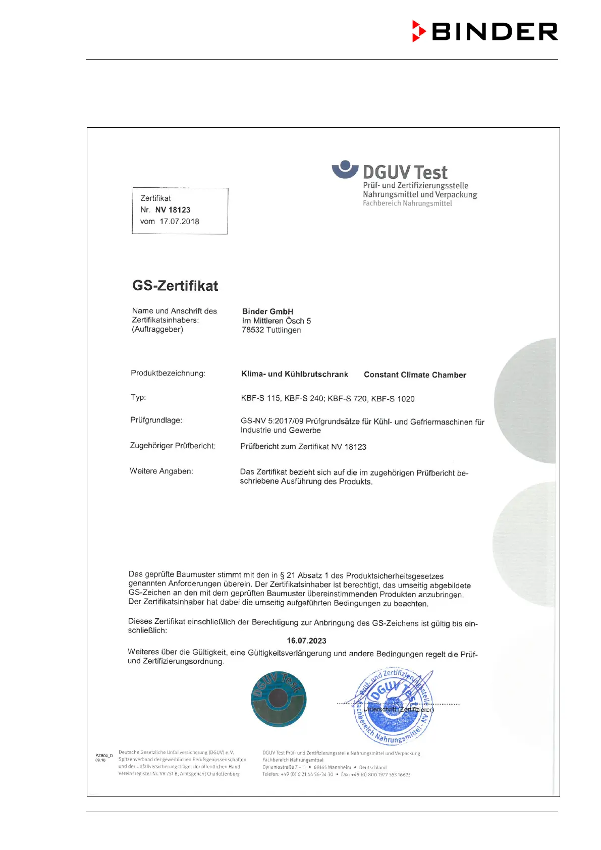 Binder KBF-S - Certificate for the GS Mark of Conformity of the Deutsche Gesetzliche Unfallversicherung E.V. (German Social Accident Insurance) DGUV