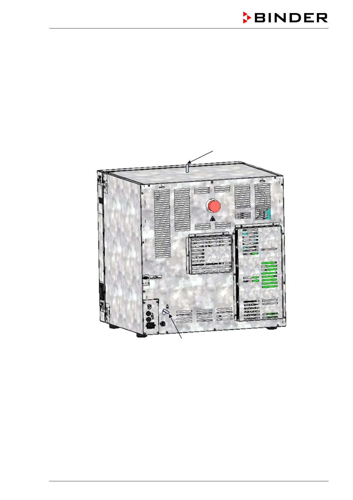 Figure 15: Position of the inert gas ports on the top panel (A) and on the chamber rear (B)