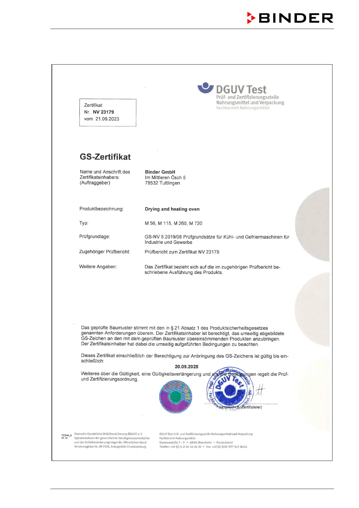 Binder M 56 - Certificate for the GS Mark of Conformity of the Deutsche Gesetzliche Unfallversicherung E.V. (German Social Accident Insurance) DGUV