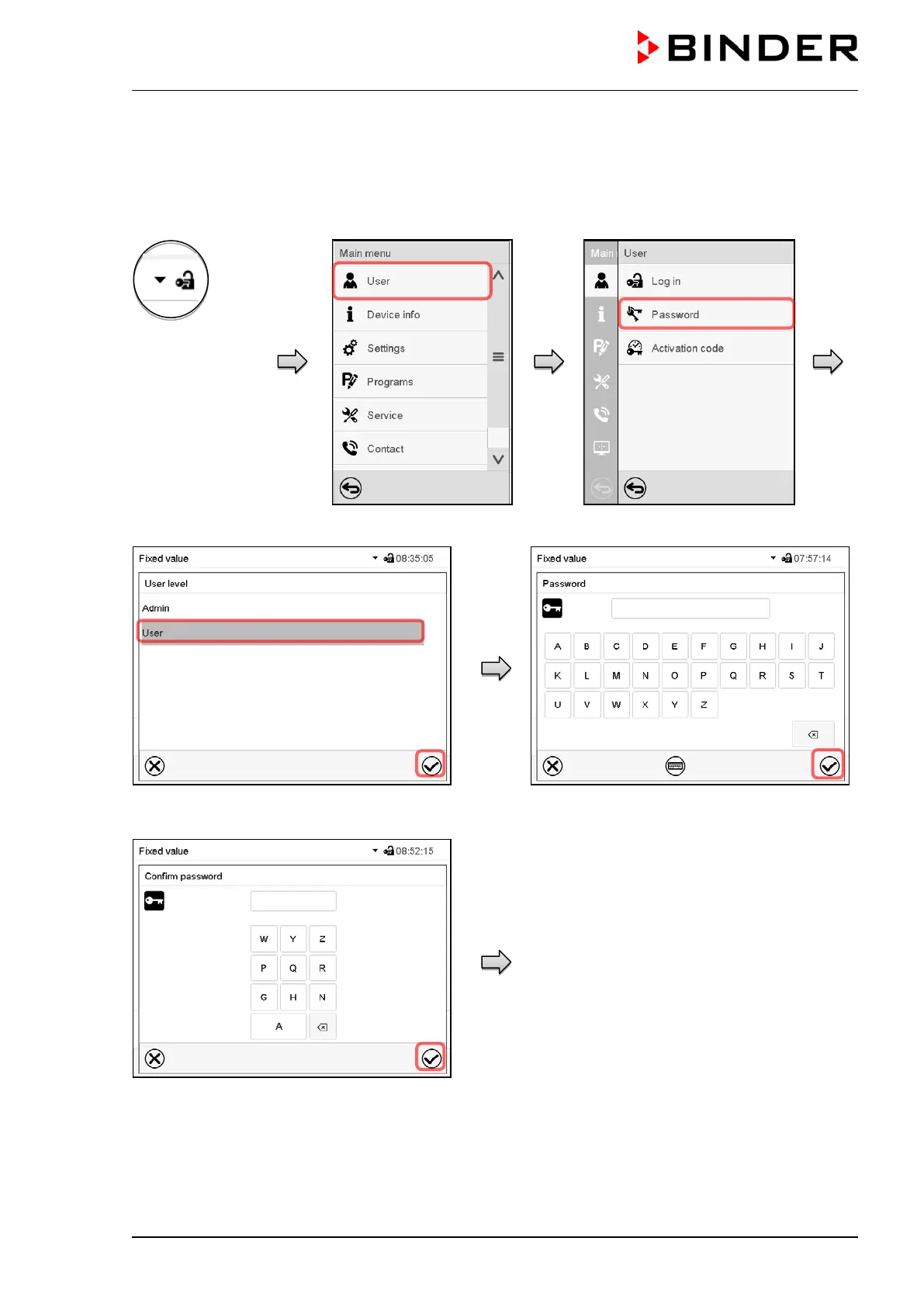 password” screen. Press the Confirm icon.