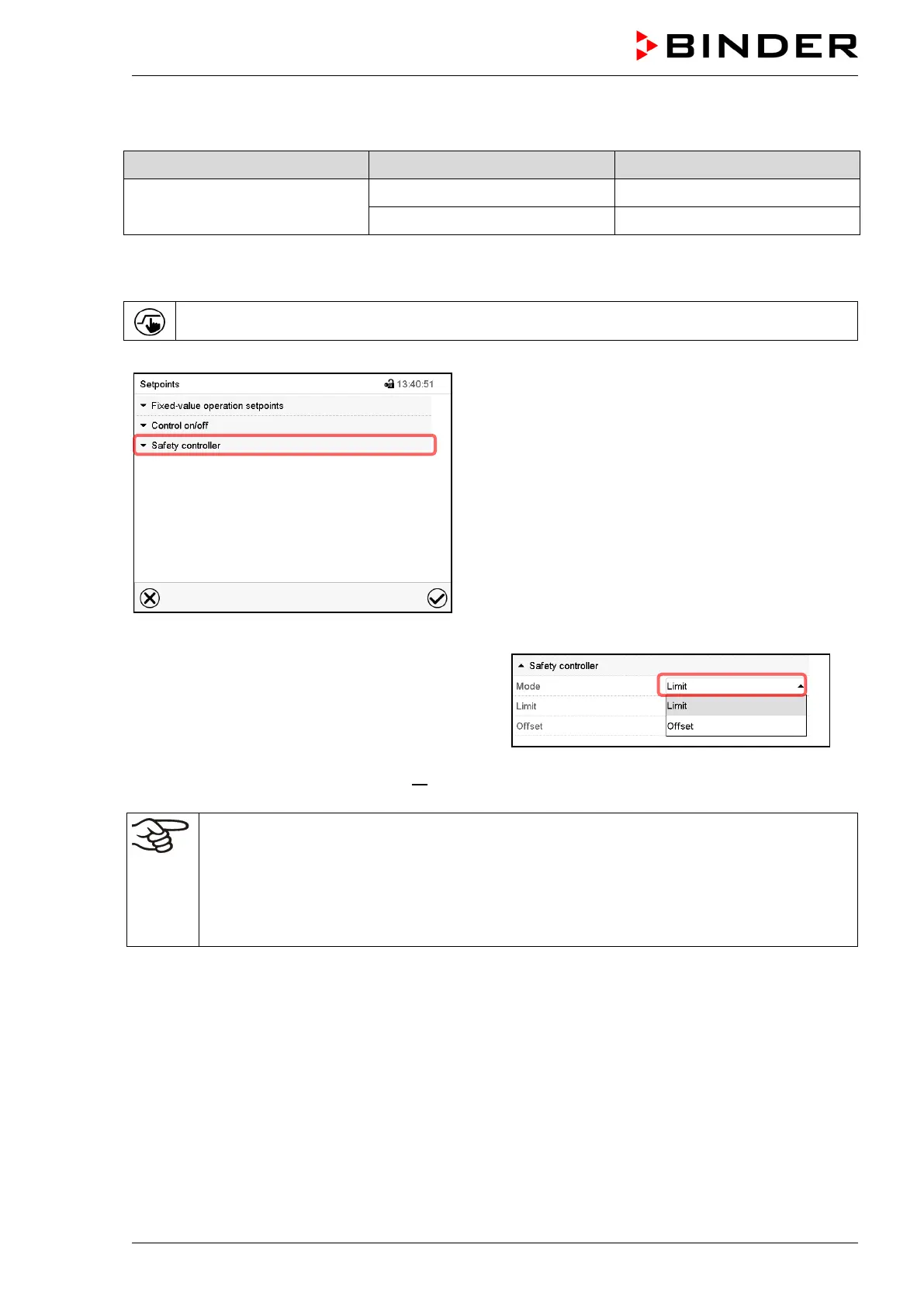 Temperature set point Safety controller mode Safety controller set-point